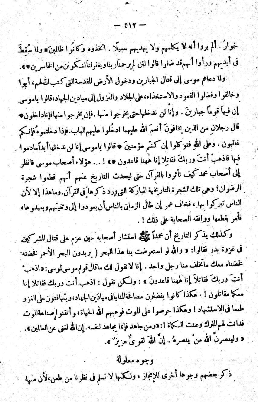 خُوَارٌ أَلَمْ يَرَوْا أَنَّهُ لا يُكَلِّمُهُمْ وَلا يَهْدِيهِمْ سَبِيلاً اتَّخَذُوهُ وَكَانُوا ظَالِمِينَ وَلَمَّا سُقِطَ فِي أَيْدِيهِمْ وَرَأَوْا أَنَّهُمْ قَدْ ضَلُّوا قَالُوا لَئِنْ لَمْ يَرْحَمْنَا رَبُّنَا وَيَغْفِرْ لَنَا لَنَكُونَنَّ مِنَ الْخَاسِرِينَ} ولما دعاهم موسى إلى قتال الجبارين ودخول الأرض المقدسة التي كتب الله لهم أبوا وخالفوا وفضلوا القعود والاستخذاء على الجلاد والنزول إلى ميادين الجهاد {قَالُوا يَا مُوسَى إِنَّ فِيهَا قَوْماً جَبَّارِينَ وَإِنَّا لَنْ نَدْخُلَهَا حَتَّى يَخْرُجُوا مِنْهَا فَإِنْ يَخْرُجُوا مِنْهَا فَإِنَّا دَاخِلُونَ قَالَ رَجُلانِ مِنَ الَّذِينَ يَخَافُونَ أَنْعَمَ اللَّهُ عَلَيهِمَا ادْخُلُوا عَلَيْهِمُ الْبَابَ فَإِذَا دَخَلْتُمُوهُ فَإِنَّكُمْ غَالِبُونَ وَعَلَى اللَّهِ فَتَوَكَّلُوا إِنْ كُنْتُمْ مُؤْمِنِينَ قَالُوا يَا مُوسَى إِنَّا لَنْ نَدْخُلَهَا أَبَداً مَا دَامُوا فِيهَا فَاذْهَبْ أَنْتَ وَرَبُّكَ فَقَاتِلا إِنَّا هَاهُنَا قَاعِدُونَ} !.. هؤلاء أصحاب موسى فانظر إلى أصحاب محمد كيف تأثروه بالقرآن حتى ليحدث التاريخ عنهم أنهم قطعوا شجرة الرضوان وهي تلك الشجرة التاريخية المباركة التي ورد ذكرها في القرآن وما هذا إلا لأن الناس تبركوا بها فخاف عمر إن طال الزمان بالناس أن يعودوا إلى وثنيتهم ويعبدوها فأمر بقطعها ووافقه الصحابة على ذلك!.