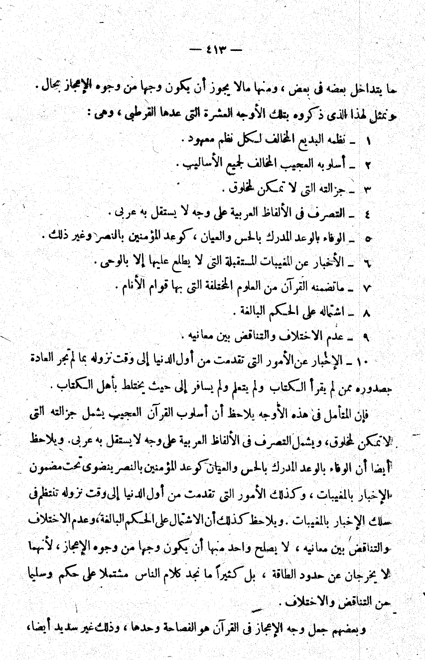 فإن المتأمل في هذه الأوجه يلاحظ أن أسلوب القرآن العجيب يشمل جزالته التي لا تمكن لمخلوق ويشمل التصرف في الألفاظ العربية على وجه لا يستقل به عربي ويلاحظ أيضا أن الوفاء بالوعد المدرك بالحس والعيان كوعد المؤمنين بالنصر ينضوي تحت مضمون الإخبار بالمغيبات وكذلك الأمور التي تقدمت من أول الدنيا إلى وقت نزوله تنتظم في سلك الإخبار بالغيبات ويلاحظ كذلك أن الاشتمال على الحكم البالغة وعدم الاختلاف والتناقض بين معانيه لا يصلح واحد منها أن يكون وجها من وجوه الإعجاز لأنهما لا يخرجان عن حدود الطاقة بل كثيرا ما نجد كلام الناس مشتملا على حكم وسليما من التناقض والاختلاف.