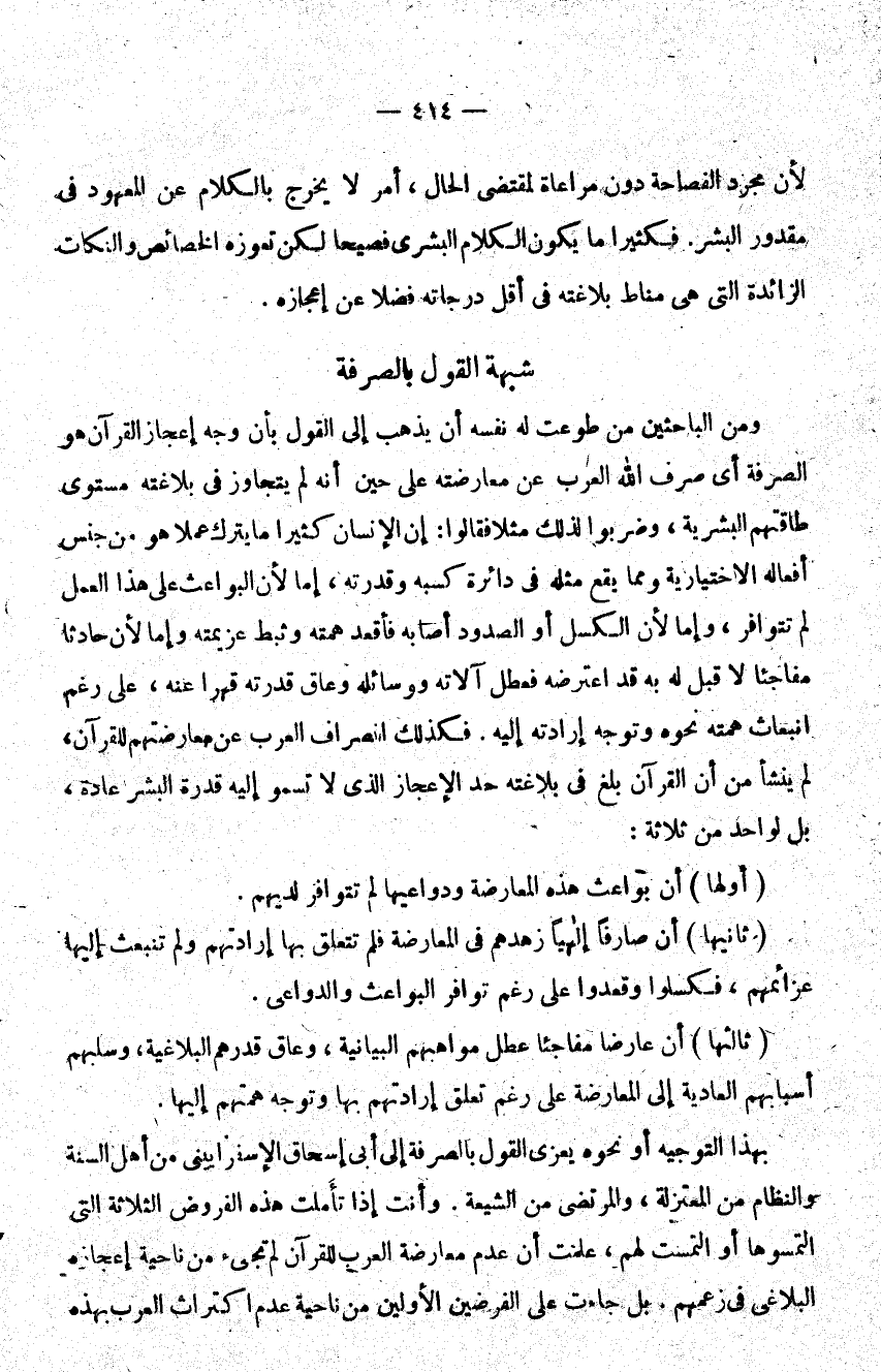 بهذا التوجيه أو نحوه يعزى القول بالصرفة إلى أبي إسحاق الإسفراييني من أهل السنة والنظام من المعتزلة والمرتضى من الشيعة وأنت إذا تأملت هذه الفروض الثلاثة التي التمسوها أو التمست لهم علمت أن عدم معارضة العرب للقرآن لم تجيء من ناحية إعجازه البلاغي في زعمهم بل جاءت على الفرضين الأولين من ناحية عدم اكتراث العرب بهذه