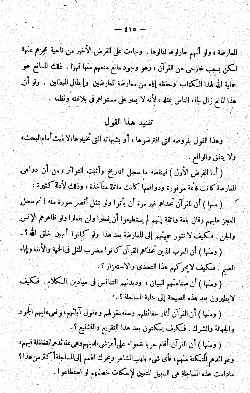 المعارضة ولو أنهم حاولوها لنالوها وجاءت على الفرض الأخير من ناحية عجزهم عنه لكن بسبب خارجي عن القرآن وهو وجود مانع منعهم منها قهرا ذلك المانع هو حماية الله لهذا الكتاب وحفظه إياه من معارضة المعارضين وإبطال المبطلين ولو أن هذا المانع زال لجاء الناس بمثله لأنه لا يعلو على مستواهم في بلاغته ونظمه.