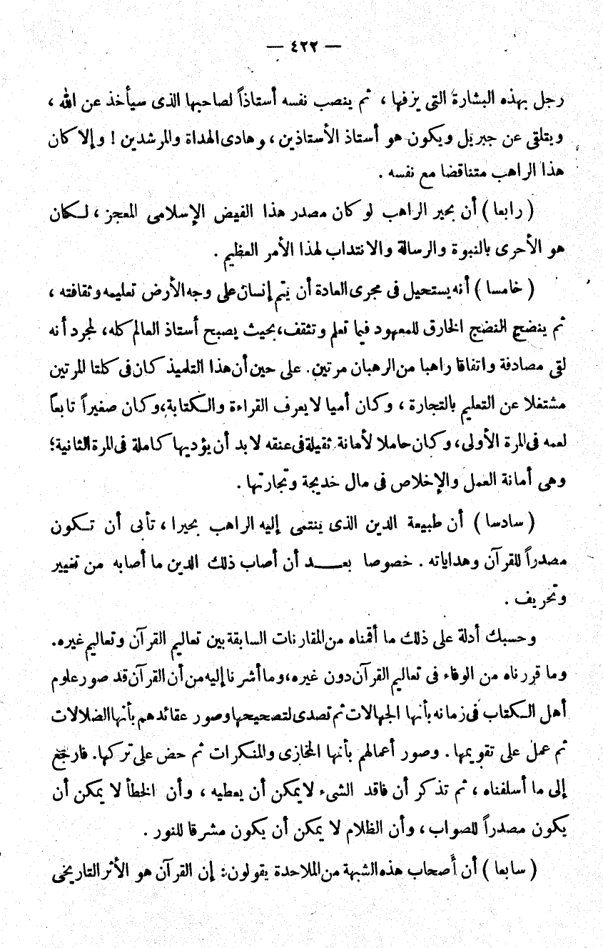 سادسا أن طبيعة الدين الذي ينتمي إليه الراهب بحيرا تأبى أن تكون مصدرا للقرآن وهداياته خصوصا بعد أن أصاب ذلك الدين ما أصابه من تغيير وتحريف.