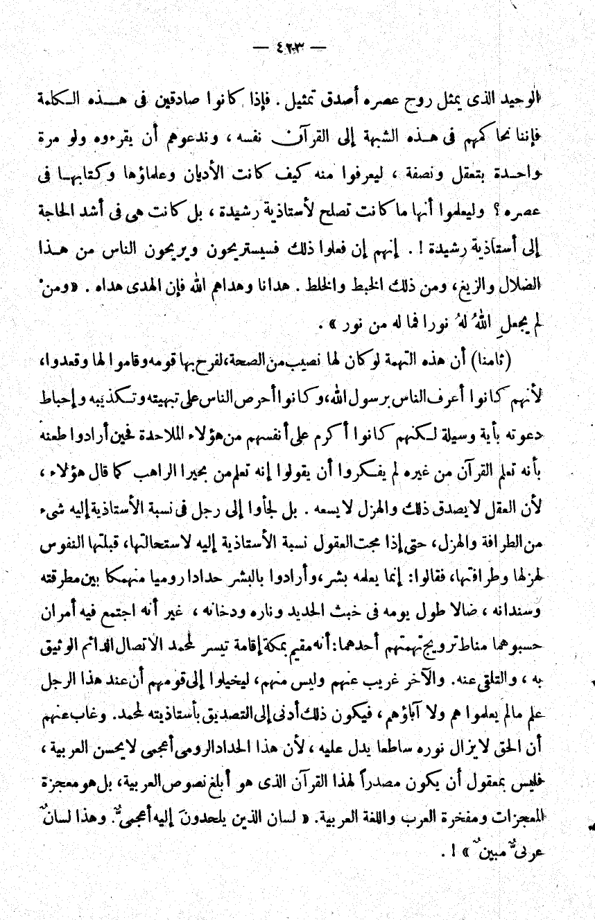الوحيد الذي يمثل روح عصره أصدق تمثيل فإذا كانوا صادقين في هذه الكلمة فإننا نحاكمهم في هذه الشبهة إلى القرآن نفسه وندعوهم أن يقرؤوه ولو مرة واحدة بتعقل ونصفه ليعرفوا منه كيف كانت الأديان وعلماؤها وكتابها في عصره وليعلموا أنها ما كانت تصلح لأستاذية رشيدة بل كانت هي في أشد الحاجة إلى أستاذية رشيدة إنهم إن فعلوا ذلك فسيستريحون ويريحون الناس من هذا الضلال والزيغ ومن ذلك الخبط والخلط هدانا وهداهم الله فإن الهدي هداه. {وَمَنْ لَمْ يَجْعَلِ اللَّهُ لَهُ نُوراً فَمَا لَهُ مِنْ نُورٍ} .