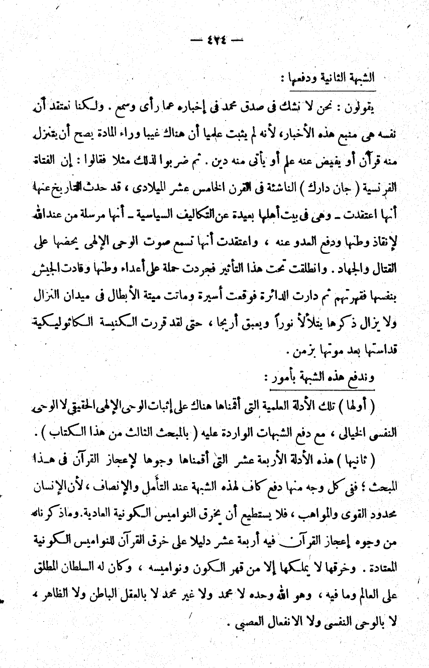 ثانيها هذه الأدلة الأربعة عشر التي أقمناها وجوها لإعجاز القرآن في هذا المبحث ففي كل وجه منها دفع كاف لهذه الشبهة عند التأمل والإنصاف لأن الإنسان محدود القوى والمواهب فلا يستطيع أن يخرق النواميس الكونية العادية وما ذكرناه من وجوه إعجاز القرآن فيه أربعة عشر دليلا على حرف القرآن للنواميس الكونية المعتادة وخرقها لا يملكها إلا من قهر الكون ونواميسه وكان له السلطان المطلق على العالم وما فيه وهو الله وحده لا محمد ولا غير محمد لا بالعقل الباطن ولا الظاهر لا بالوحي النفسي ولا الانفعال العصبي.