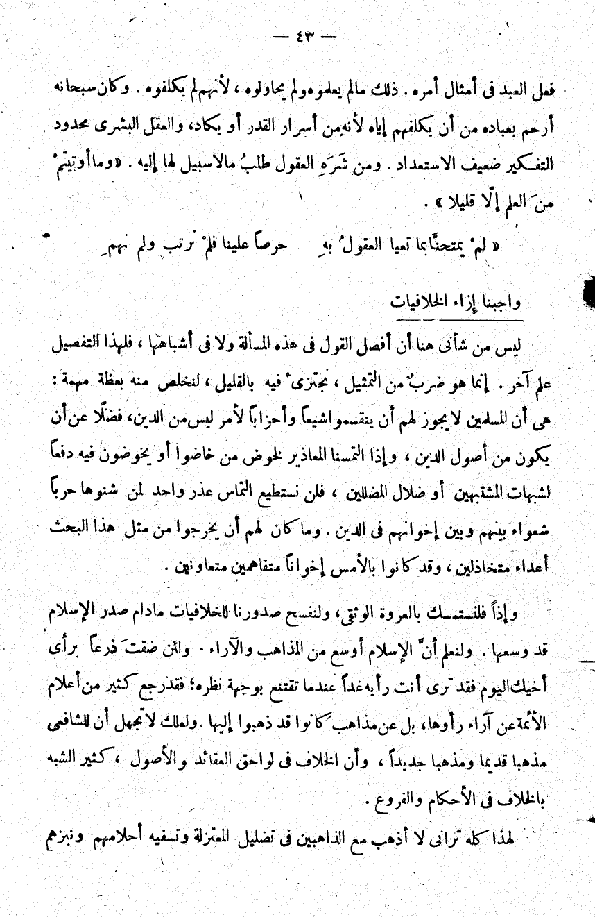 وإذا فلنستمسك بالعروة الوثقى ولنفسح صدورنا للخلافيات ما دام صدر الإسلام قد وسعها ولنعلم أن الإسلام أوسع من المذاهب والآراء ولئن ضقت ذرعا برأي أخيك اليوم فقد ترى أنت رأيه غدا عندما تقتنع بوجهة نظره فقد رجع كثير من أعلام الأئمة عن آراء رأوها بل عن مذاهب كانوا قد ذهبوا إليها ولعلك لا تجهل أن للشافعي مذهبا قديما ومذهبا جديدا وأن الخلاف في لواحق العقائد والأصول كثير الشبه بالخلاف في الأحكام والفروع.