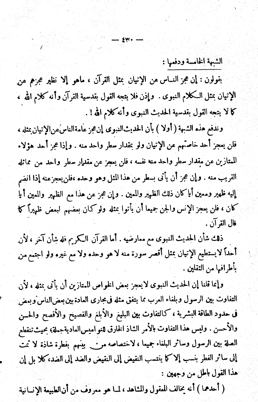 وإنما قلنا إن الحديث النبوي لا يعجز بعض الخواص الممتازين أن يأتي بمثله لأن التفاوت بين الرسول وبلغاء العرب مما يتفق مثله في مجاري العادة بين بعض الناس وبعض في حدود الطاقة البشرية كالتفاوت بين البليغ والأبلغ والفصيح والأفصح والحسن والأحسن وليس هذا التفاوت بالأمر الشاذ الخارق للنواميس العادية جملة بحيث تنقطع الصلة بين الرسول وسائر البلغاء جميعا لاختصاصه من بينهم بفطرة شاذة لا تمت إلى سائر الفطر بنسب إلا كما ينتسب النقيض إلى النقيض والضد إلى الضد كلا بل إن هذا القول باطل من وجهين: