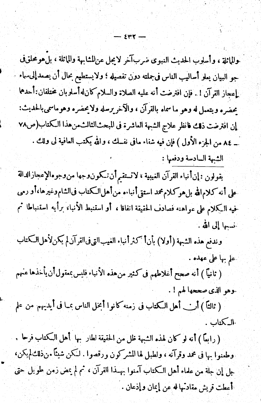 والمماثلة وأسلوب الحديث النبوي ضرب آخر لا يجل عن المشابهة والمماثلة بل هو محلق في جو البيان يعلو أساليب الناس في جملته دون تفصيله ولا يستطيع بحال أن يصعد إلى سماء إعجاز القرآن! فإن افترضت أنه كان له أسلوبا مختلفان أحدهما يحضره ويتعمل له وهو ما سماه بالقرآن والآخر يرسله ولا يحضره وهو ما سمي بالحديث إن افترضت ذلك فانظر علاج الشبهة العاشرة في المبحث الثالث من هذا الكتاب من "ص 78 – 84 الجزء الأول" فإن فيه شفاء ما في نفسك والله يكتب العافية لي ولك.