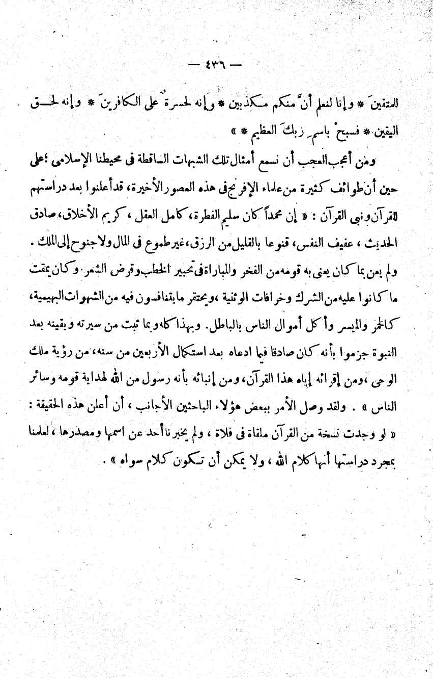 ومن أعجب العجب أن نسمع أمثال تلك الشبهات الساقطة في محيطنا الإسلامي على حين أن طوائف كثيرة من علماء الإفرنج في هذه العصور الأخيرة قد أعلنوا بعد دراستهم للقرآن ونبي القرآن إن محمدا كان سليم الفطرة وكامل العقل كريم الأخلاق صادق الحديث عفيف النفس قنوعا بالقليل من الرزق غير طموع في المال ولا جنون إلى الملك ولم يعن بما كان يعنى به قومه من الفخر والمباراة في تحبير الخطب وقرض الشعر وكان يمقت ما كانوا عليه من الشرك وخرافات الوثنية ويحتقر ما يتنافسون فيه من الشهوات البهيمة كالخمر والميسر وأكل أموال الناس بالباطل وبهذا كله وبما ثبت من سيرته ويقينه بعد النبوة جزموا بأنه كان صادقا فيما ادعاه بعد استكمال الأربعين من سنه من رؤية ملك الوحي ومن إقرائه إياه هذا القرآن ومن إنبائه بأنه رسول من الله لهداية قومه وسائر الناس ولقد وصل الأمر ببعض هؤلاء الباحثين الأجانب أن أعلن هذه الحقيقة لو وجدت نسخة من القرآن ملقاة في فلاه ولم يخبرنا أحد عن اسمها ومصدرها لعلمنا بمجرد دراستها أنها كلام الله ولا يمكن أن تمون كلام سواه.