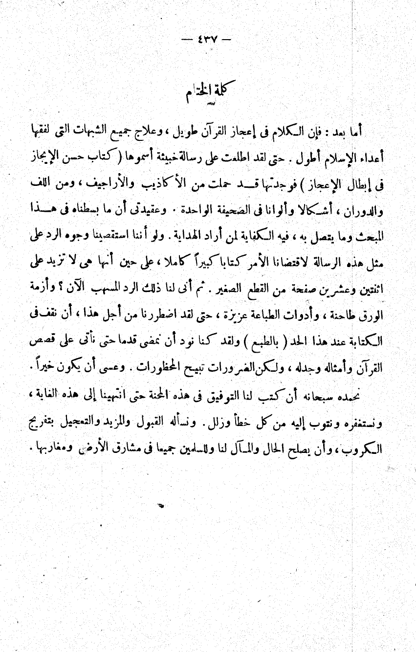 أما بعد الكلام في إعجاز جميع الشبهات التي لفقها أعداء الإسلام أطول حتى لقد اطلعت على رسالة خبيثة أسموها حسن الإيجاز في إبطال الإعجاز فوجدتها قد حملت من الأكاذيب والأراجيف ومن اللف والدوران أشكالا وألوانا في الصفيحة الواحدة وعقيدتي أن ما بسطناه في هذا المبحث وما يتصل به فيه الكفاية لمن أراد الهداية ولو أننا استقصينا وجوه الرد على مثل هذه الرسالة لاقتضينا الأمر كتابا كبيرا كاملا على حين أنها هي لا تزيد على اثنتين وعشرين صفحة من القطع الصغير ثم أنى لنا ذلك الرد المسهب الآن وأزمة الورق طاحنه وأدوات الطباعة عزيزة حتى لقد اضطررنا من أجل هذا أن نقف في الكتابة عند هذا الحد بالطبع ولقد كنا نود أن نمضي قدما حتى نأتي على قصص القرآن وأمثاله وجدله ولكن الضرورات تبيح المحظورات وعسى أن يكون خيرا.