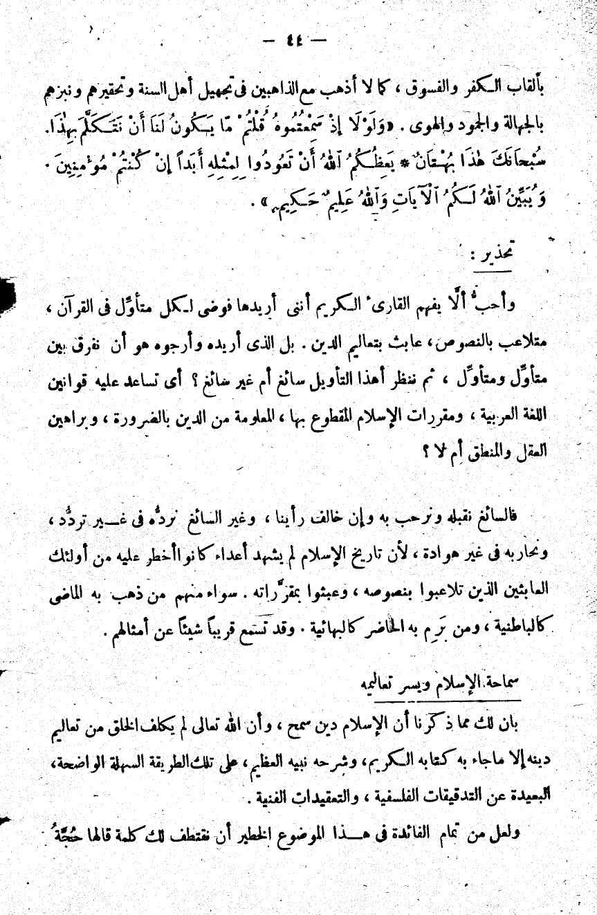 وأحب ألا يفهم القاريء الكريم أنني أريدها فوضى لكل متأول في القرآن متلاعب بالنصوص عابث بتعاليم الدين بل الذي أريده وأرجوه أن نفرق بين متأول ومتأول ثم ننظر أهذا التأويل سائغ أم غير سائغ أي تساعد عليه قوانين اللغة العربية ومقررات الإسلام المقطوع بها المعلومة من الدين بالضرورة وبراهين العقل والمنطق أم لا.