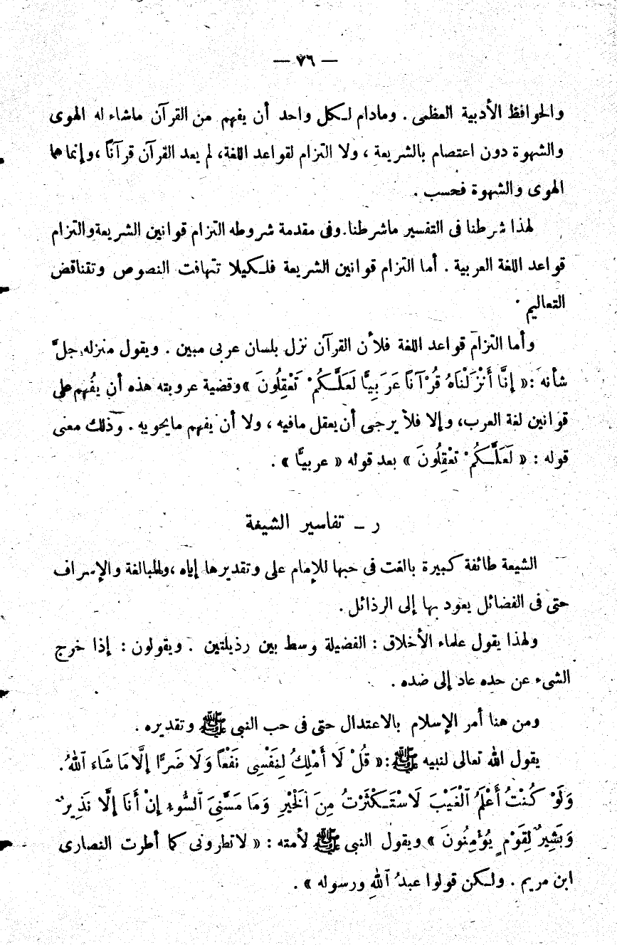 والحوافظ الأدبية العظمى وما دام لكل واحد أن يفهم من القرآن ما شاء له الهوى والشهوة دون اعتصام بالشريعة ولا التزام لقواعد اللغة لم يعد القرآن قرآنا وإنما هما الهوى والشهوة فحسب.