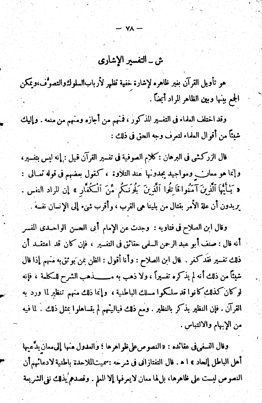 قال الزركشي في البرهان كلام الصوفية في تفسير القرآن قيل إنه ليس بتفسير وإنما هو معان ومواجيد يجدونها عند التلاوة كقول بعضهم في قوله تعالى: {يَا أَيُّهَا الَّذِينَ آمَنُوا قَاتِلُوا الَّذِينَ يَلُونَكُمْ مِنَ الْكُفَّارِ} إن المراد النفس يريدون أن علة الأمر بقتال من يلينا هي القرب وأقرب شيء إلى الإنسان نفسه.