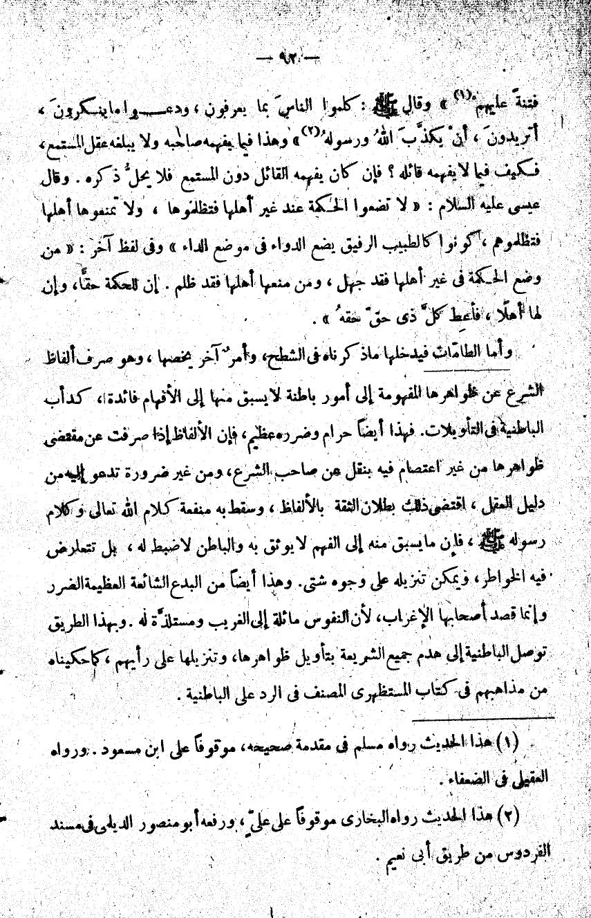 فتنة عليهم1" وقال صلى الله عليه وسلم: "كلموا الناس بما يعرفون ودعوا ما ينكرون أتريدون أن يكذب الله ورسوله2" وهذا فيما يفهمه صاحبه ولا يبلغه عقل المستمع فكيف فيما لا يفهمه قائله فإن كان يفهمه القائل دون المستمع فلا يحل ذكره وقال: عيسى عليه السلام لا تضعوا الحكمة عند غير أهلها فتظلموها ولا تمنعوها أهلها فتظلموهم كونوا كالطبيب الرفيق يضع الدواء في موضع الداء وفي لفظ آخر من وضع الحكمة في غير أهلها فقد جهل ومن منعها أهلها فقد ظلم إن للحكمة حقا وإن لها أهلا فأعط كل ذي حق حقه.