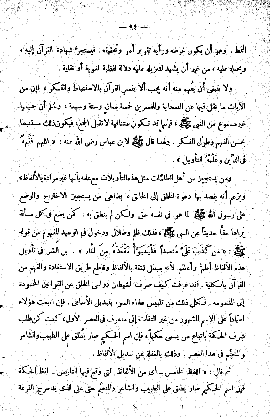 ومن يستجيز من أهل الطامات مثل هذه التأويلات مع علمه بأنها غير مرادة بالألفاظ ويزعم أنه يقصد بها دعوة الخلق إلى الخالق يضاهي من يستجيز الاختراع والوضع على رسول صلى الله عليه وسلم لما هو في نفسه حق ولكن لم ينطق به. كمن يضع في كل مسألة يراها حقا حديثا عن النبي صلى الله عليه وسلم فذلك ظلم وضلال ودخول في الوعيد المفهوم من قوله صلى الله عليه وسلم: "من كذب علي متعمدا فليتبوأ مقعده من النار". بل الشر في تأويل هذه الألفاظ أطم وأعظم لأنه مبطل للثقة بالألفاظ وقاطع طريق الاستفادة والفهم من القرآن بالكلية فقد عرفت كيف صرف الشيطان دواعي الخلق عن القوانين المحمودة إلى المذمومة فكل ذلك من تلبيس علماء السوء بتبديل الأسامي فإن اتبعت هؤلاء اعتمادا على الاسم المشهور من غير التفات إلى ما عرف في العصر الأول كنت كمن طلب شرف الحكمة باتباع من يسمى حكيما فإن اسم الحكيم صار يطلق على الطبيب والشاعر والمنجم في هذا العصر وذلك بالغفلة عن تبديل الألفاظ.