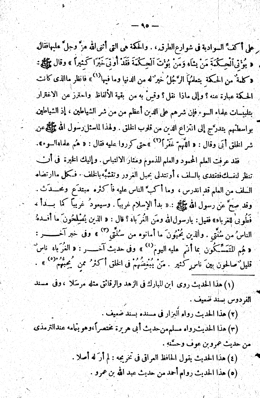 على أكف السوادية في شوارع الطرق والحكمة هي التي أثنى الله عز وجل عليها فقال: {يُؤْتِي الْحِكْمَةَ مَنْ يَشَاءُ وَمَنْ يُؤْتَ الْحِكْمَةَ فَقَدْ أُوتِيَ خَيْراً كَثِيراً} وقال صلى الله عليه وسلم: "كلمة من الحكمة يتعلمها الرجل خير له من الدنيا وما فيها1" فانظر ما الذي كانت الحكمة عبارة عنه؟ وإلى ماذا نقل وقس به من بقية الألفاظ واحترز عن الاغترار بتلبيسات علماء السوء فإن شرهم على الدين أعظم من شر الشياطين إذ الشياطين بواسطتهم يتدرج إلى انتزاع الدين من قلوب الخلق ولهذا لما سئل رسول الله صلى الله عليه وسلم عن شر الخلق أبى وقال: "اللهم غفرا2" حتى كرروا عليه فقال: "هم علماء السوء".