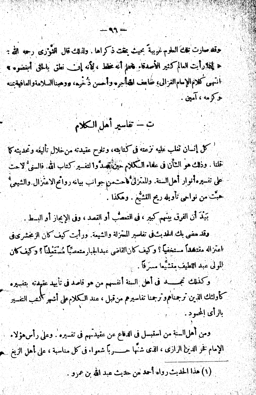 كل إنسان تغلب عليه نزعته في كتابته وتلوح عقيدته من خلال تأليفه وتحديثه كما قلنا وذلك هو الشأن في علماء الكلام حين تصدوا لتفسير كتاب الله فالسني لاحت على تفسيره أنوار أهل السنة والمعتزلي فاحت من جوانب بيانه روائح الاعتزال والشيعي هبت من نواحي تأويله ريح التشيع وهكذا.