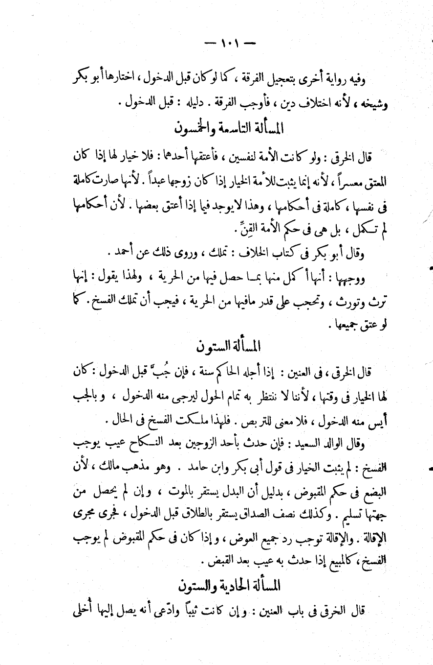 المسألة التاسعة والخمسون قَالَ الخرقي: ولو كانت الأمة لنفسين فأعتقها أحدهما فلا خيار لها إِذَا كَانَ المعتق معسرا لأنه إنما يثبت للأمة الخيار إِذَا كَانَ زوجها عبدا لأنها صارت كاملة فِي نفسها كاملة فِي أحكامها وهذا لا يوجد فِيمَا إِذَا أعتق بعضها لأن أحكامها لم تكمل بل هِيَ فِي حكم الأمة القن.
