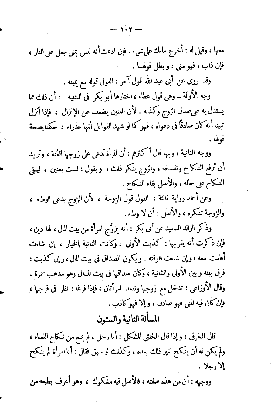 المسألة الثانية والستون قَالَ الخرقي: وَإِذَا قَالَ الخنثى المشكل أنا رجل لم يمنع من نكاح النساء ولم يكن لَهُ أن ينكح لغير ذَلِكَ بعده وكذلك لَوْ سبق فَقَالَ أنا امرأة لم ينكح إلا رجلا.