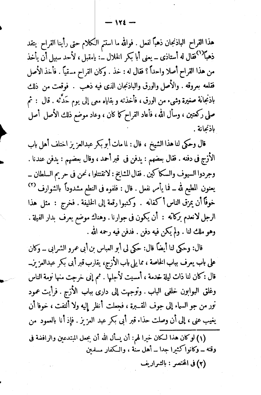 قَالَ: وحكى لنا أيضا قَالَ: حكى لي أَبُو العباس بْن أَبِي عمرو الشرابي وَكَانَ عَلَى باب يعرف بباب الخاصة مما يلي باب الأزج يقارب قبر أَبِي بكر عبد العزيز قَالَ: كَانَ لنا ذات ليلة خدمة أمسيت لأجلها ثُمَّ إني خرجت منها نومة الناس وغلق البوابون خلفي الباب وتوجهت إلى داري بباب الأزج فرأيت عمود نور من جو السماء إلى جوف المقبرة فجعلت أنظر إِلَيْهِ ولا ألتفت خوفا أن يغيب عني إلى أن وصلت حذاء قبر أَبِي بكر عبد العزيز فإذ أنا بالعمود من