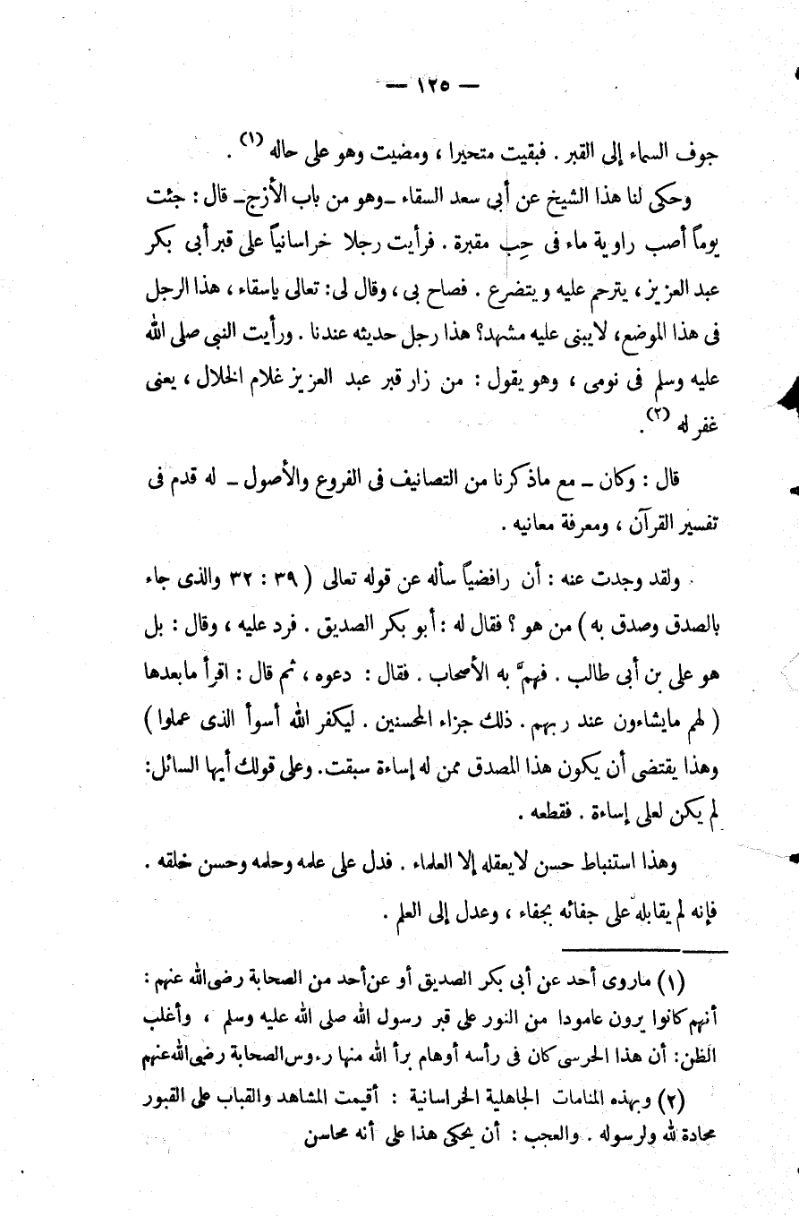 وحكى لنا هَذَا الشيخ عن أَبِي سعد السقاء وهو من باب الأزج قَالَ: جئت يوما أصب راوية ماء فِي حب مقبرة فرأيت رجلا خراسانيا عَلَى قبر أَبِي بكر عبد العزيز يترحم عَلَيْهِ ويتضرع فصاح بي وَقَالَ لي: تعالى يا سقاء هَذَا الرجل فِي هَذَا الموضع لا يبْنى عَلَيْهِ مشهد؟ هَذَا رجل حديثه عندنا ورأيت النبي - صَلَّى اللَّهُ عَلَيْهِ وَسَلَّمَ - فِي نومي وهو يقول: من زار قبر عبد العزيز غلام الخلال يعني غفر لَهُ.