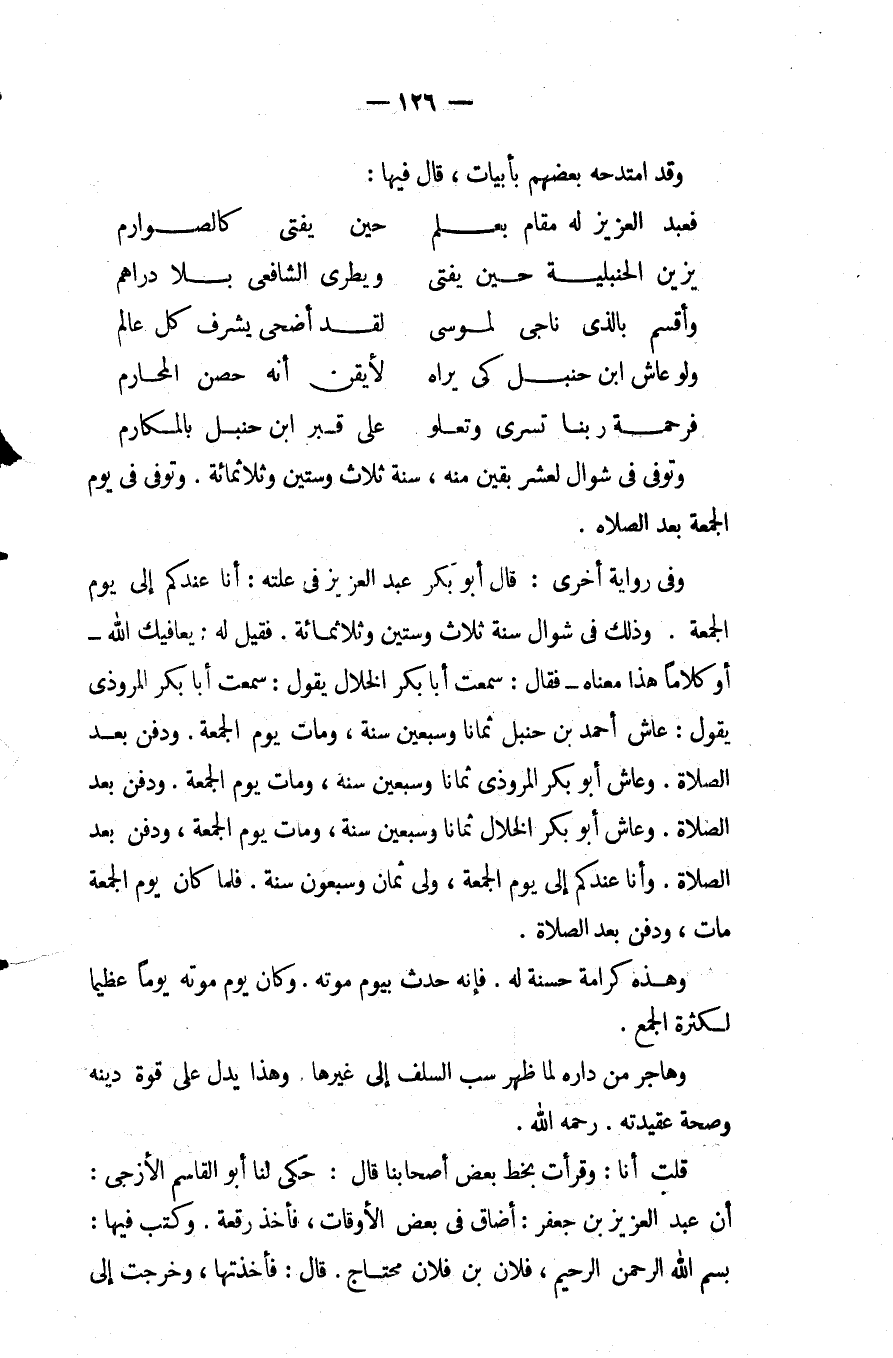 وفي رواية أخرى قَالَ أَبُو بكر عبد العزيز فِي علته: أنا عندكم إلى يوم الجمعة وَذَلِكَ فِي شوال سنة ثلاث وستين وثلاثمائة فقيل لَهُ: يعافيك اللَّه أو كلاما هَذَا معناه فَقَالَ: سمعت أبا بكر الخلال يقول: سمعت أبا بكر المروذي يقول: عاش أَحْمَد بْن حنبل ثمانا وسبعين سنة ومات يوم الجمعة ودفن بعد الصلاة وعاش أَبُو بكر المروذي ثمانا وسبعين سنة ومات يوم الجمعة ودفن بعد الصلاة وعاش أبو بكر الخلال ثمانا وسبعين سنة ومات يوم الجمعة ودفن بعد الصلاة وأنا عندكم إلى يوم الجمعة ولي ثمان وسبعون سنة فلما كَانَ يوم الجمعة مات ودفن بعد الصلاة.