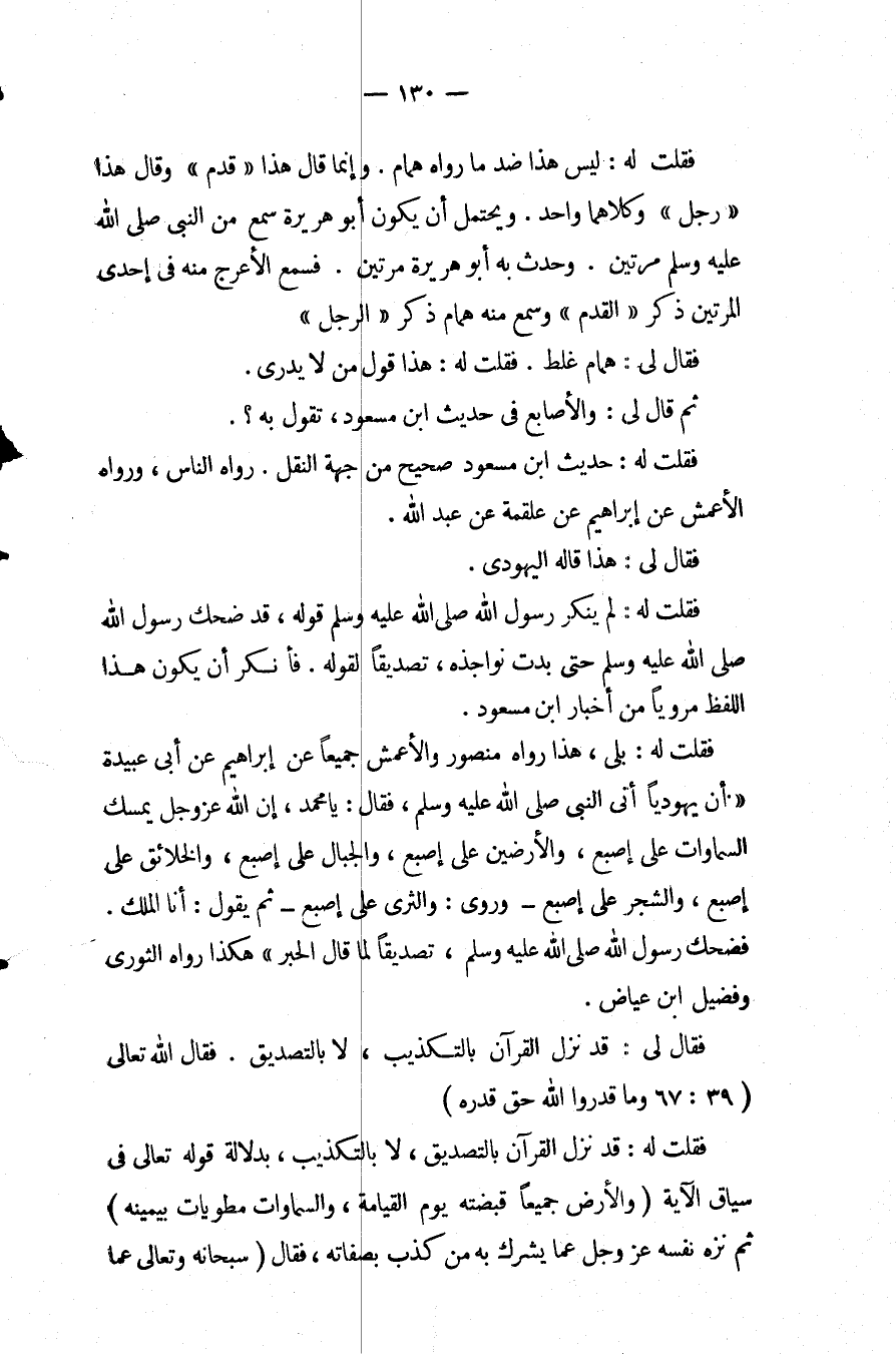 فقلت لَهُ: بلى هَذَا رَوَاهُ مَنْصُورٌ وَالأَعْمَشُ جَمِيعًا عَنْ إِبْرَاهِيمَ عَنْ أَبِي عُبَيْدَةَ " أَنَّ يَهُودِيًّا أَتَى النَّبِيّ - صَلَّى اللَّهُ عَلَيْهِ وَسَلَّمَ - فَقَالَ: يَا مُحَمَّدُ إِنَّ اللَّهَ عز وجل يمسك السماوات عَلَى أَصْبُعٍ وَالأَرْضِينَ عَلَى أَصْبُعٍ وَالْجِبَالَ عَلَى أَصْبُعٍ وَالْخَلائِقَ عَلَى أَصْبُعٍ وَالشَّجَرَ عَلَى أَصْبُعٍ وَرَوَى: وَالثَّرَى عَلَى أَصْبُعٍ ثُمَّ يَقُولُ: أَنَا الْمَلِكُ فَضَحِكَ رَسُولُ اللَّهِ - صَلَّى اللَّهُ عَلَيْهِ وَسَلَّمَ - تَصْدِيقًا لما قال الخبر " هَكَذَا رَوَاهُ الثَّوْرِيُّ وَفُضَيْلُ بْنُ عِيَاضٍ.