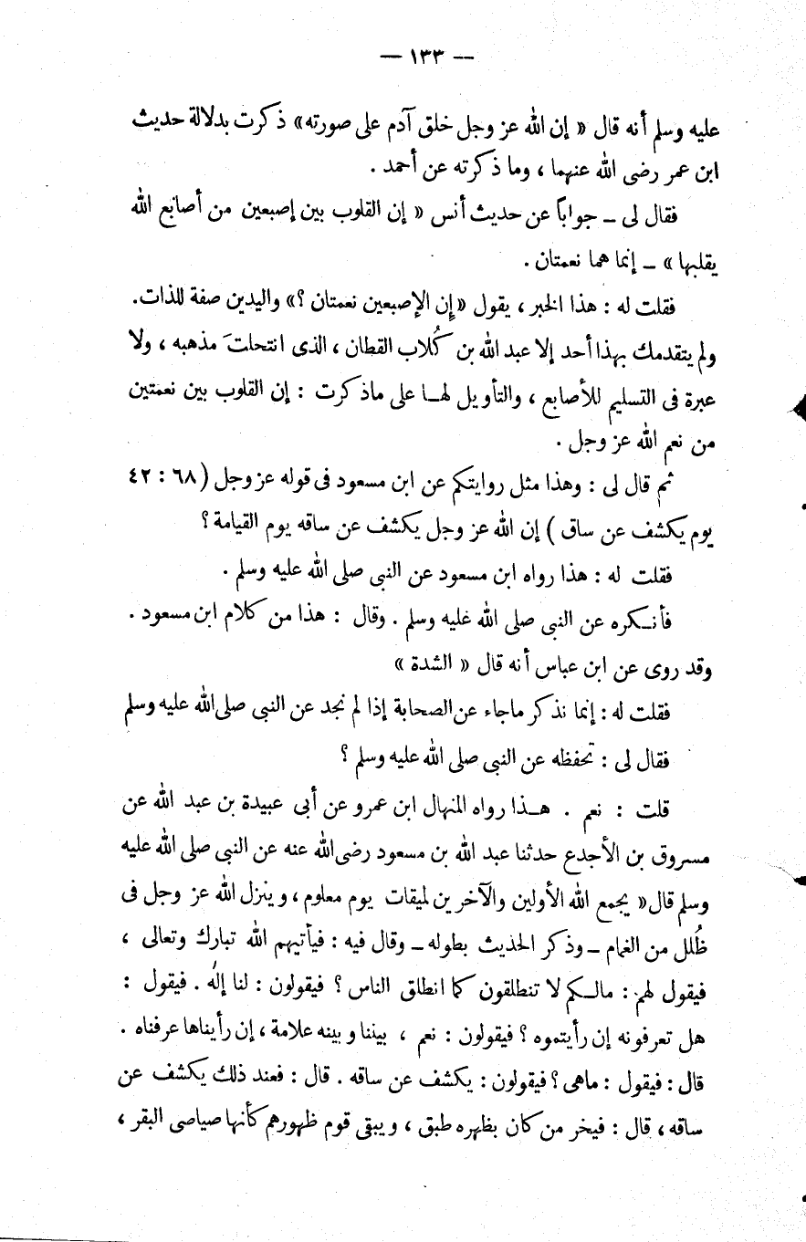 ثُمَّ قَالَ لي: وهذا مثل روايتكم عن ابْن مسعود فِي قوله عز وجل يَوْمَ يُكْشَفُ عَنْ ساق إن اللَّه عز وجل يكشف عن ساقه يوم القيامة؟.