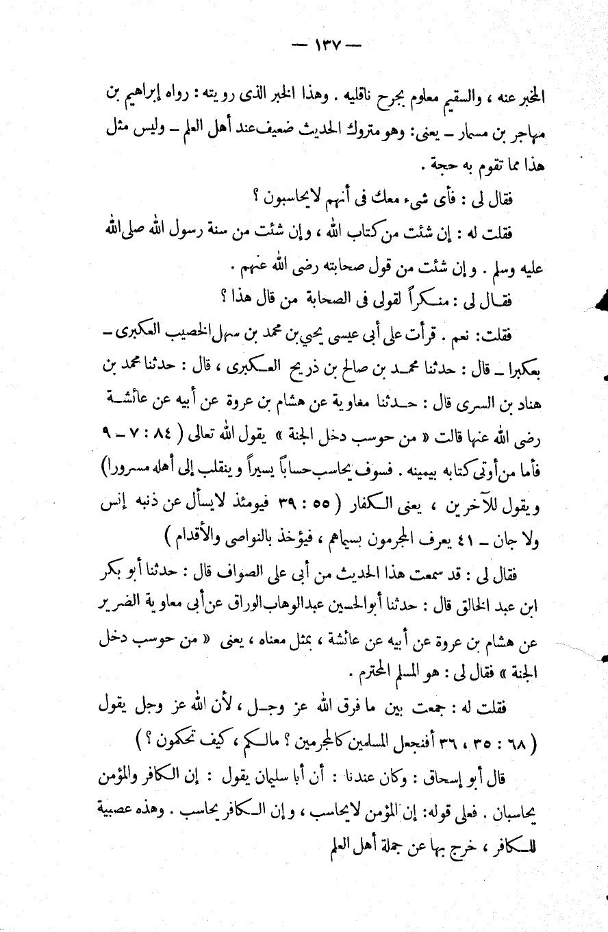 فقلت: نعم قَرَأْتُ عَلَى أَبِي عِيسَى يَحْيَى بْنِ مُحَمَّدِ بْنِ سَهْلٍ الْخصيبِ الْعُكْبَرِيِّ بِعُكْبَرَا قَالَ: حَدَّثَنَا مُحَمَّدُ بْنُ صَالِحِ بْنِ ذُرَيْحٍ الْعُكْبَرِيُّ قَالَ: حَدَّثَنَا مُحَمَّدُ بْنُ هَنَّادِ بْنِ السُّرِّيِّ قَالَ: حَدَّثَنَا مُعَاوِيَةُ عَنْ هِشَامِ بْنِ عُرْوَةَ عَنْ أَبِيهِ عَنْ عَائِشَةَ رَضِيَ اللَّهُ عَنْهَا قَالَتْ: مَنْ حُوسِبَ دَخَلَ الْجَنَّةَ يَقُولُ اللَّهُ تَعَالَى فَأَمَّا مَنْ أُوتِيَ كِتَابَهُ بِيَمِينِهِ فَسَوْفَ يُحَاسَبُ حِسَابًا يَسِيرًا وَيَنْقَلِبُ إِلَى أَهْلِهِ مسروراً وَيَقُولُ لِلآخَرِينَ يَعْنِي الْكُفَّارَ {فَيَوْمَئِذٍ لا يُسْأَلُ عَنْ ذَنْبِهِ إِنْسٌ ولا جان، فبأي آلاء ربكما تكذبان، يُعْرَفُ الْمُجْرِمُونَ بِسِيمَاهُمْ فَيُؤْخَذُ بِالنَّوَاصِي والأقدام}