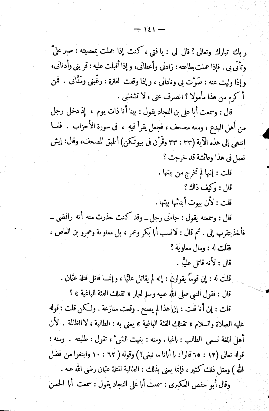 قُلْتُ: إن أنا قُلْتُ إن هَذَا لم يصح وقعت منازعة ولكن قُلْتُ قوله عَلَيْهِ الصلاة والسلام تقتلك الفئة الباغية يعني به الطالبة لا الظالمة لأن أهل اللغة تسمي الطالب باغيا ومنه بغيت الشيء تقول طلبته ومنه قوله تعالى قَالُوا يَا أَبَانَا مَا نَبْغِي وقوله وَابْتَغُوا مِنْ فَضْلِ اللَّهِ ومثل ذَلِكَ كثير فإنما يعني بذلك الطالبة لقتلة عثمان رَضِيَ اللَّهُ عَنْهُ.