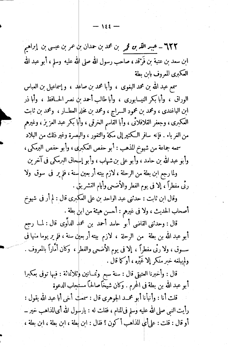 عبيد اللَّه بن محمد بْنِ مُحَمَّد بْن حمدان بْن عمر بْن عيسى بْن إبراهيم بْن سعد بْن عتبة بْن فرقد صاحب رَسُول اللَّهِ - صَلَّى اللَّهُ عَلَيْهِ وَسَلَّمَ - أَبُو عبد اللَّه العكبري المعروف بابْن بطة
