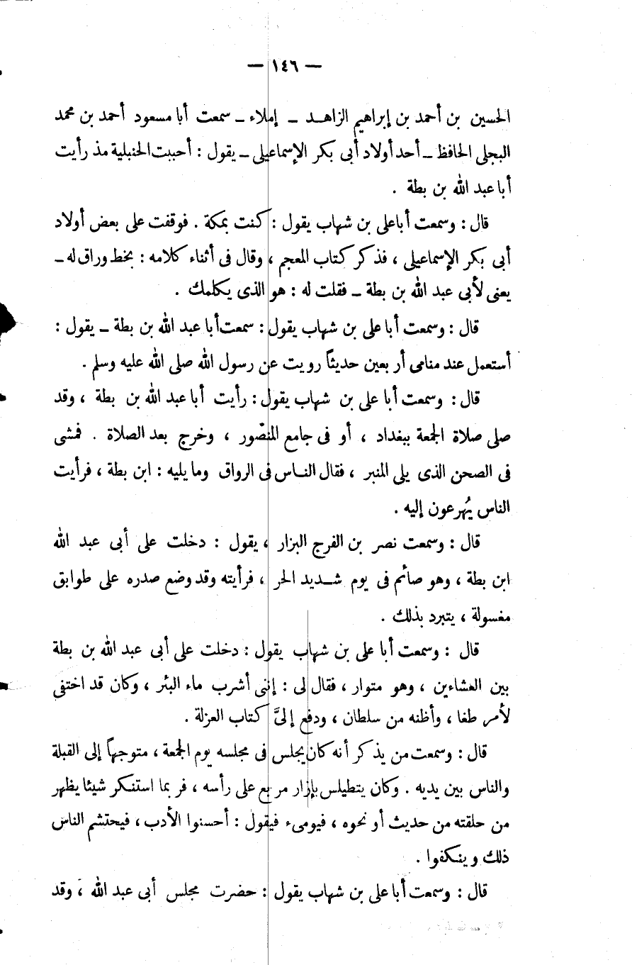 قَالَ: وسمعت أبا علي بْن شهاب يقول: رأيت أبا عبد اللَّه بْن بطة وقد صلى صلاة الجمعة ببغداد أو في جامع المنصور وخرج بعد الصلاة فمشى فِي الصحن الَّذِي يلي المنبر فَقَالَ الناس فِي الرواق وما يليه ابْن بطة فرأيت الناس يهرعون إِلَيْهِ.