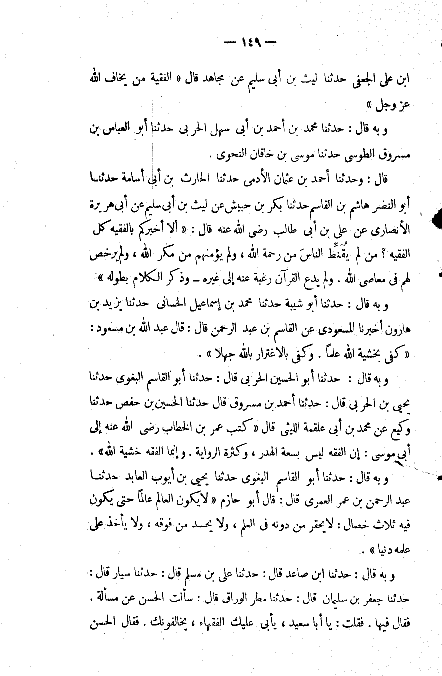 وبه قَالَ: حَدَّثَنَا أَبُو الحسين الْحَرْبِيُّ قَالَ: حَدَّثَنَا أَبُو الْقَاسِمِ الْبَغَوِيُّ حَدَّثَنَا يَحْيَى بْنُ الْحَرْبِيِّ قَالَ: حَدَّثَنَا أَحْمَدُ بْنُ مَسْرُوقٍ قَالَ: حَدَّثَنَا الْحُسَيْنُ بْنُ حَفْصٍ حَدَّثَنَا وَكِيعٌ عَنْ مُحَمَّدِ بْنِ أَبِي عَلْقَمَةَ اللَّيْثِيِّ قَالَ: كَتَبَ عُمَر بْن الخطاب رَضِيَ اللَّهُ عَنْهُ إِلَى أَبِي مُوسَى إِنَّ الْفِقْهَ لَيْسَ بِسِعَةِ الْهدرِ وَكَثْرَةِ الرِّوَايَةِ وَإِنَّمَا الْفِقْهُ خَشْيَةُ اللَّهِ.