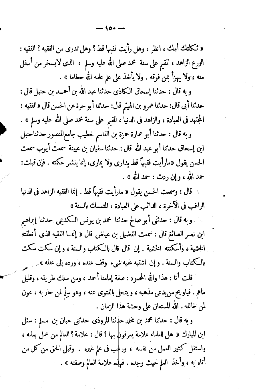 وَبِهِ قَالَ: حَدَّثَنَا إِسْحَاقُ الْكَاذِيُّ حَدَّثَنَا عَبْدُ اللَّه بْن أَحْمَد بن حنبل قَالَ حَدَّثَنَا أَبِي قَالَ حَدَّثَنَا عَمْرُو بْنُ الْهَيْثَمِ قَالَ حَدَّثَنَا أَبُو حُرَّةَ عَنِ الْحَسَنِ قَالَ: الْفَقِيهُ الْمُجْتَهِدُ فِي الْعِبَادَةِ وَالزَّاهِدُ فِي الدُّنْيَا الْمُقِيمُ عَلَى سُنَّةِ محمد - صَلَّى اللَّهُ عَلَيْهِ وَسَلَّمَ -.