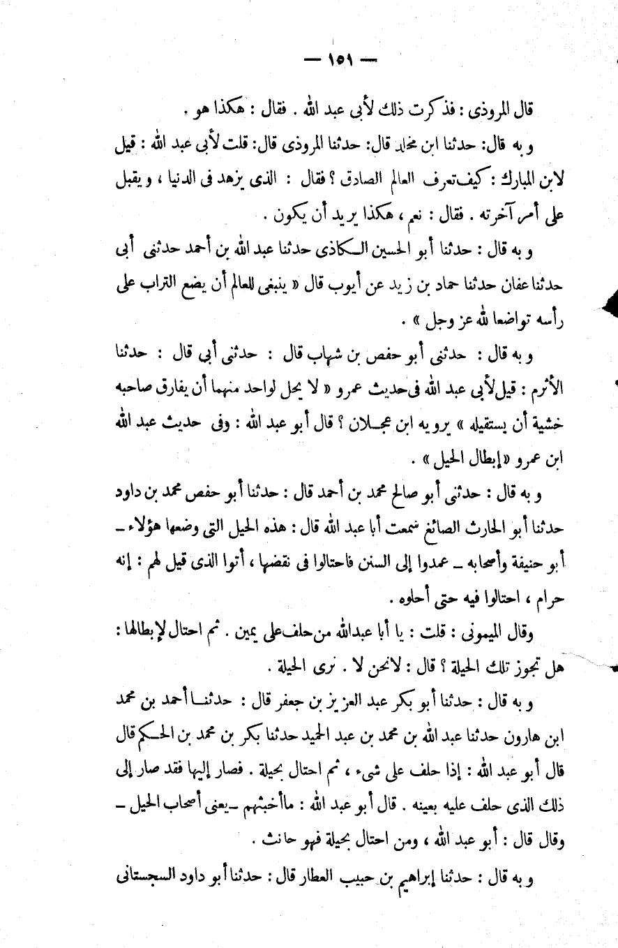 وبه قال: حدثني أبو محمد صالح بْن أَحْمَد قَالَ: حَدَّثَنَا أَبُو حفص مُحَمَّد بْن داود حَدَّثَنَا أَبُو الحارث الصائغ سمعت أبا عبد اللَّه قَالَ: هَذِهِ الحيل الَّتِي وضعها هَؤُلاءِ أَبُو حنيفة وأصحابه عمدوا إلى السنن فاحتالوا فِي نقضها أتوا الَّذِي قِيلَ لهم: إنه حرام احتالوا فِيهِ حتى أحلوه.