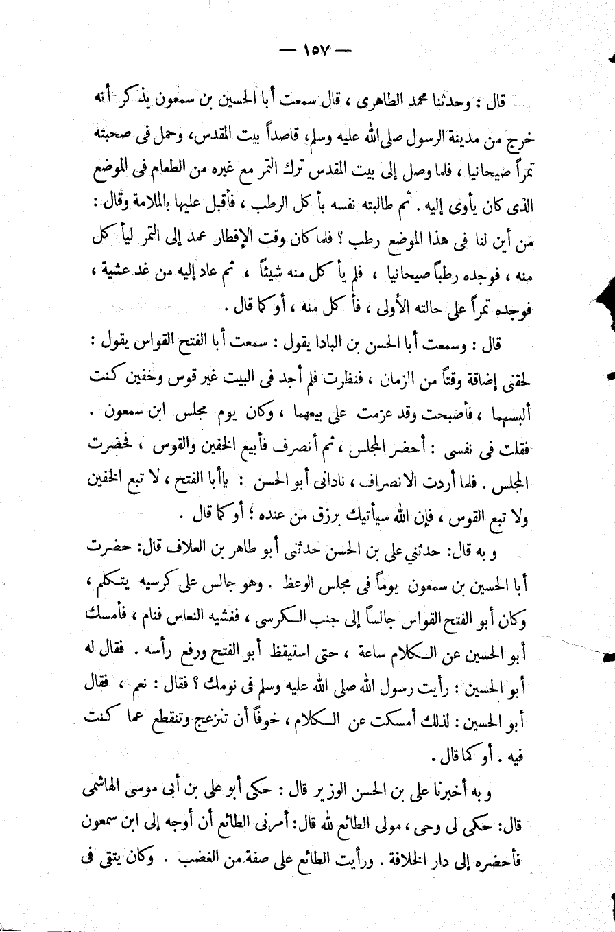 قَالَ: وَحَدَّثَنَا مُحَمَّد الطاهري قَالَ: سمعت أبا الحسين بْن سمعون يذكر أنه خرج من مدينة الرسول - صَلَّى اللَّهُ عَلَيْهِ وَسَلَّمَ - قاصدا بيت المقدس وحمل فِي صحبته تمرا صيحانيا فلما وصل إلى بيت المقدس ترك التمر مَعَ غيره من الطعام فِي الموضع الَّذِي كَانَ يأوي إِلَيْهِ ثُمَّ طالبته نفسه بأكل الرطب فأقبل عليها بالملامة وَقَالَ: من أين لنا فِي هَذَا الموضع رطب فلما كَانَ وقت الإفطار عمد إلى التمر ليأكل مِنْهُ فوجده رطبا صيحانيا فلم يأكل مِنْهُ شيئا ثُمَّ عاد إِلَيْهِ من غد عشية فوجده تمرا عَلَى حالته الأولى فأكل مِنْهُ أو كما قَالَ.