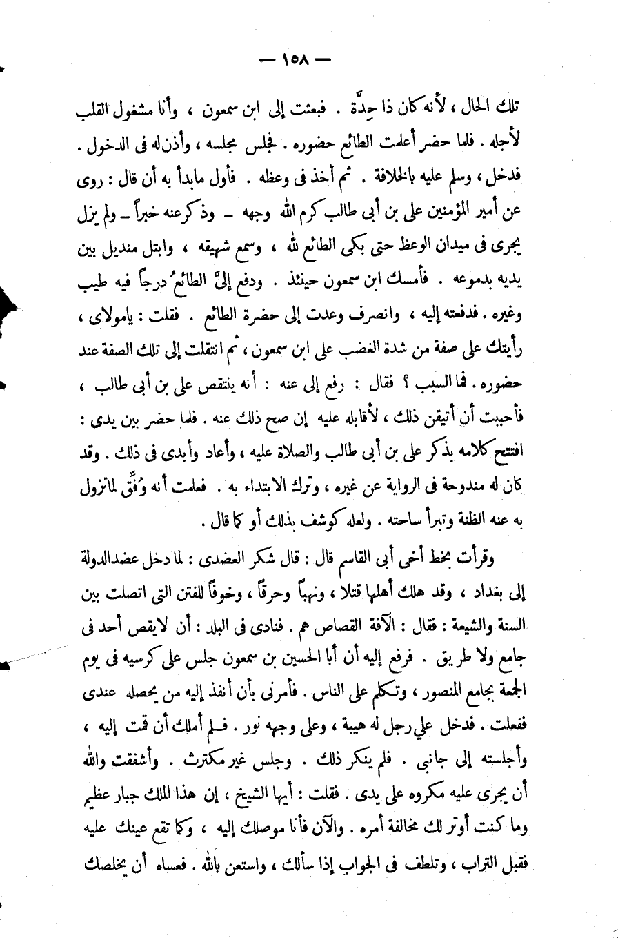 تلك الحال لأنه كَانَ ذا حدة فبعثت إلى ابْن سمعون وأنا مشغول القلب لأجله فلما حضر أعلمت الطائع حضوره فجلس مجلسه وأذن لَهُ فِي الدخول فدخل وسلم عَلَيْهِ بالخلافة ثُمَّ أخذ فِي وعظه فأول ما بدأ به أن قَالَ: روى عن أمير المؤمنين علي بْن أَبِي طالب كرم اللَّه وجهه وذكر عَنْهُ خبراً ولم يزل يجري فِي ميدان الوعظ حتى بكى الطائع لله وسمع شهيقه وابتل منديل بين يديه بدموعه فأمسك ابْن سمعون حينئذ ودفع إلي الطائع درجا فيه طيب وغيره فدفعته إِلَيْهِ وانصرف وعدت إلى حضرة الطائع فقلت: يا مولاي رأيتك عَلَى صفة من شدة الغضب عَلَى ابْن سمعون ثُمَّ انتقلت إلى تلك الصفة عند حضوره فما السبب فَقَالَ: رفع إِلي عنه أنه ينتقص علي ابن أَبِي طالب فأحببت أن أتيقن ذَلِكَ لأقابله عَلَيْهِ إن صح ذَلِكَ عَنْهُ فلما حضر بين يدي افتتح كلامه بذكر علي بْن أَبِي طالب والصلاة عَلَيْهِ وأعاد وأبدى فِي ذَلِكَ وقد كَانَ لَهُ مندوحة فِي الرواية عن غيره وترك الابتداء به فعلمت أنه وفق لما تزول به عَنْهُ الظنة وتبرأ ساحته ولعله كوشف بذلك أو كما قَالَ.