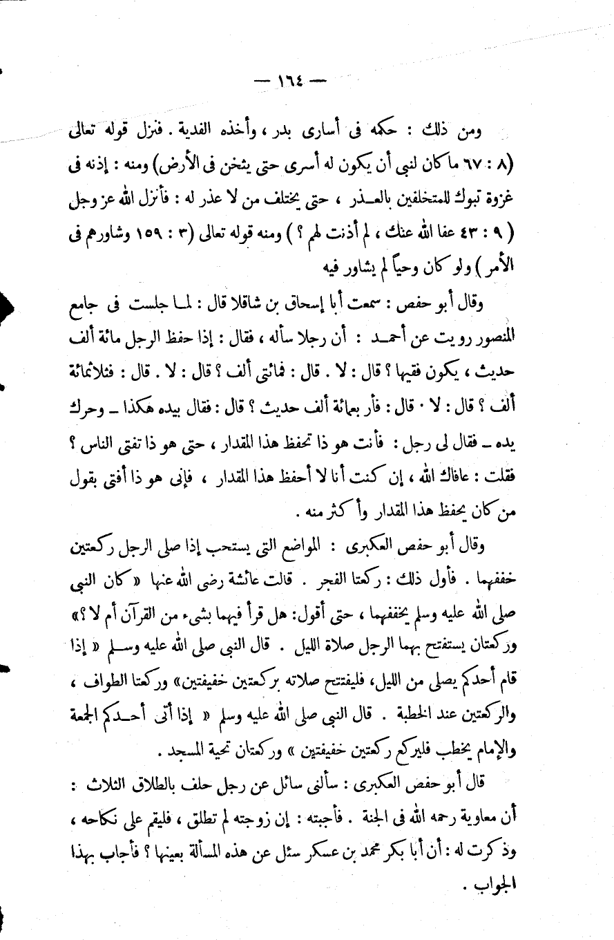 وَقَالَ أَبُو حفص: سمعت أبا إسحاق بْن شاقلا قَالَ: لما جلست فِي جامع المنصور رويت عن أَحْمَد أن رجلا سأله فَقَالَ: إِذَا حفظ الرجل مائة ألف حديث يكون فقيها؟ قَالَ: لا قَالَ: فمائتي ألف؟ قال: لا قال: فثلاثمائة ألف؟ قال: لا قال: فأربعمائة ألف حديث؟ قَالَ: فَقَالَ بيده هكذا وحرك يده فَقَالَ لي رجل: فأنت هُوَ ذا تحفظ هَذَا المقدار حتى هُوَ ذا تفتي الناس؟ فقلت عافاك اللَّه إن كنت أنا لا أحفظ هَذَا المقدار فإني هُوَ ذا أفتى بقول من كَانَ يحفظ هَذَا المقدار وأكثر مِنْهُ.