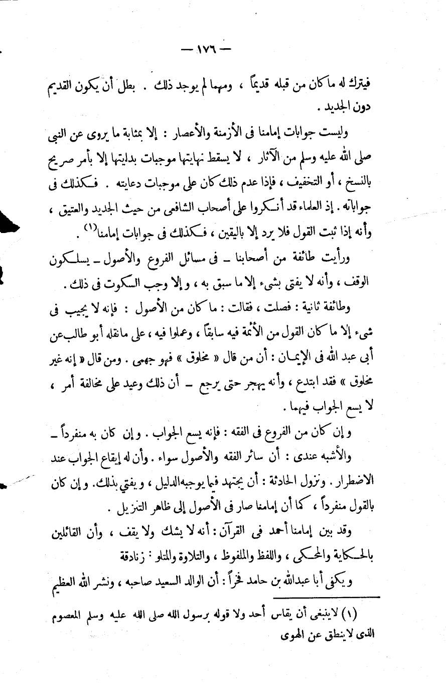 وليست جوابات إمامنا فِي الأزمنة والأعصار إلا بمثابة ما يروى عَنِ النَّبِيِّ - صَلَّى اللَّهُ عَلَيْهِ وَسَلَّمَ - من الآثار لا يسقط نهايتها موجبات بدايتها إلا بأمر صريح بالنسخ أو التخفيف فَإِذَا عدم ذَلِكَ كَانَ عَلَى موجبات دعايته فكذلك فِي جواباته إذ العلماء قد أنكروا عَلَى أصحاب الشافعي من حيث الجديد والعتيق وأنه إِذَا ثبت القول فلا يرد إلا باليقين فكذلك في جوابات إمامنا ورأيت طائفة من أصحابنا فِي مسائل الفروع والأصول يسلكون الوقف وأنه لا يفتى بشيء إلا ما سبق به وإلا وجب السكوت فِي ذَلِكَ.