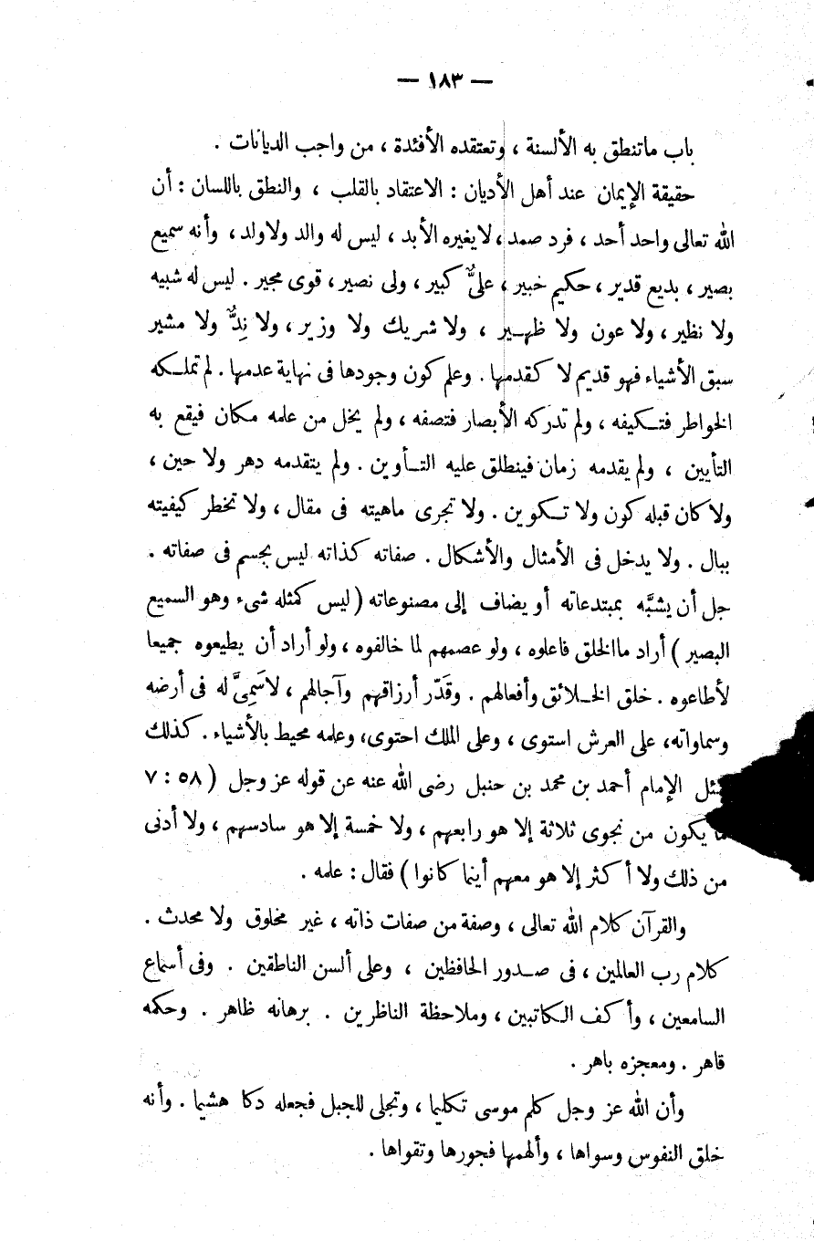 حقيقة الإيمان عند أهل الأديان الاعتقاد بالقلب والنطق باللسان: أن اللَّه تعالى واحد أحد فرد صمد لا يغيره الأبد ليس لَهُ والد ولا ولد وأنه سميع بصير بديع قدير حكيم خبير علي كبير ولي نصير قوي مجير ليس لَهُ شبيه ولا نظير ولا عون ولا ظهير ولا شريك ولا وزير ولا ند ولا مشير سبق الأشياء فهو قديم لا كقدمها وعلم كون وجودها فِي نهاية عدمها لم تملكه الخواطر فتكيفه ولم تدركه الأبصار فتصفه ولم يخل من علمه مكان فيقع به التأبين ولم يقدمه زمان فينطلق عَلَيْهِ التأوين ولم يتقدمه دهر ولا حِينَ ولا كَانَ قبله كون ولا تكوين ولا تجري ماهيته فِي مقال ولا تخطر كيفيته ببال ولا يدخل فِي الأمثال والأشكال صفاته كذاته ليس بجسم فِي صفاته جل أن يشبه بمبتدعاته أو يضاف إلى مصنوعاته لَيْسَ كَمِثْلِهِ شيء وهو السميع البصير أراد ما الخلق فاعلوه ولو عصمهم لما خالفوه ولو أراد أن يطيعوه جميعا لأطاعوه خلق الخلائق وأفعالهم وقدر أرزاقهم وآجالهم لا سمي لَهُ فِي أرضه وسماواته عَلَى العرش استوى وعلى الملك احتوى وعلمه محيط بالأشياء.