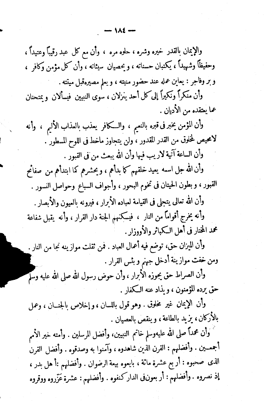 وأن محمدا - صَلَّى اللَّهُ عَلَيْهِ وَسَلَّمَ - خاتم النبيين وأفضل المرسلين وأمته خير الأمم أجمعين وأفضلهم القرن الَّذِينَ شاهدوه وآمنوا به وصدقوه وأفضل القرن الَّذِي صحبوه أربع عشرة مائة بايعوه بيعة الرضوان وأفضلهم أهل بدر إذ نصروه وأفضلهم أربعون فِي الدار كنفوه وأفضلهم عشرة عزروه ووقروه