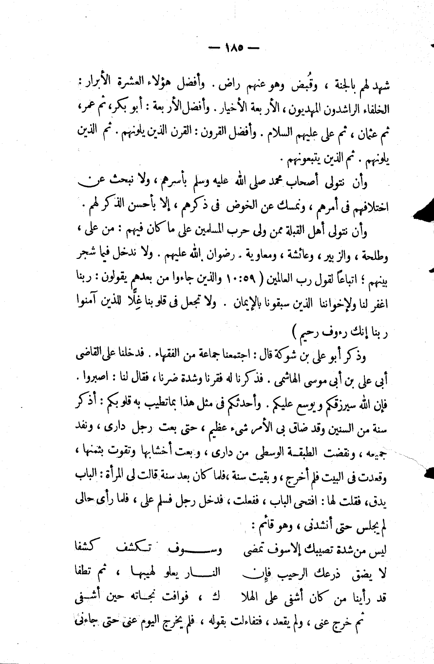 وأن نتولى أهل القبلة ممن ولي حرب المسلمين عَلَى ما كَانَ فيهم من علي وطلحة والزبير وعائشة ومعاوية رضوان اللَّه عليهم ولا ندخل فِيمَا شجر بينهم إتباعا لقول رب العالمين وَالَّذِينَ جَاءُوا مِنْ بَعْدِهِمْ يَقُولُونَ رَبَّنَا اغْفِرْ لَنَا وَلإِخْوَانِنَا الَّذِينَ سَبَقُونَا بِالإِيمَانِ وَلا تَجْعَلْ فِي قُلُوبِنَا غِلا لِلَّذِينَ آمَنُوا ربنا إنك رؤوف رحيم وذكر أَبُو علي بْن شوكة قَالَ: اجتمعنا جماعة من الفقهاء فدخلنا عَلَى القاضي أَبِي علي بْن أَبِي موسى الهاشمي فذكرنا لَهُ فقرنا وشدة ضرنا فَقَالَ لنا: اصبروا فإن اللَّه سيرزقكم ويوسع عليكم وأحدثكم فِي مثل هَذَا بما تطيب به قلوبكم: أذكر سنة من السنين وقد ضاق بي الأمر شيء عظيم حتى بعت رجل داري ونفد جميعه ونقضت الطبقة الوسطى من داري وبعت أخشابها وتقوت بثمنها وقعدت فِي البيت فلم أخرج وبقيت سنة فلما كَانَ بعد سنة قالت لي المرأة: الباب يدق فقلت لها افتحي الباب ففعلت فدخل رجل فسلم علي فلما رأى حالي لم يجلس حتى أنشدني وهو قائم: