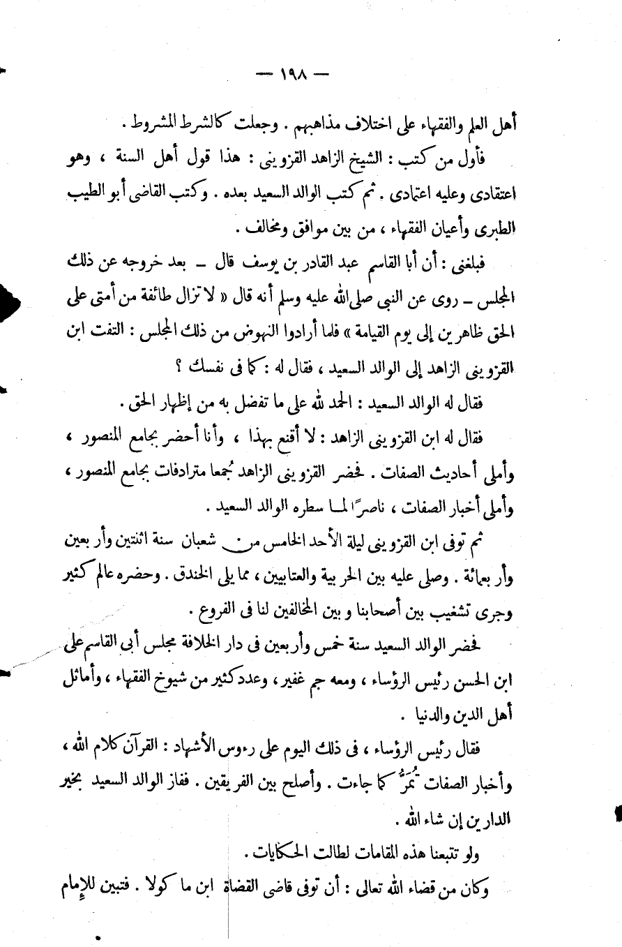فَقَالَ لَهُ ابْن القزويني الزاهد: لا أقنع بهذا وأنا أحضر بجامع المنصور وأملي أحاديث الصفات فحضر القزويني الزاهد جمعا مترادفات بجامع المنصور وأملى أخبار الصفات ناصرا لما سطره الوالد السعيد.