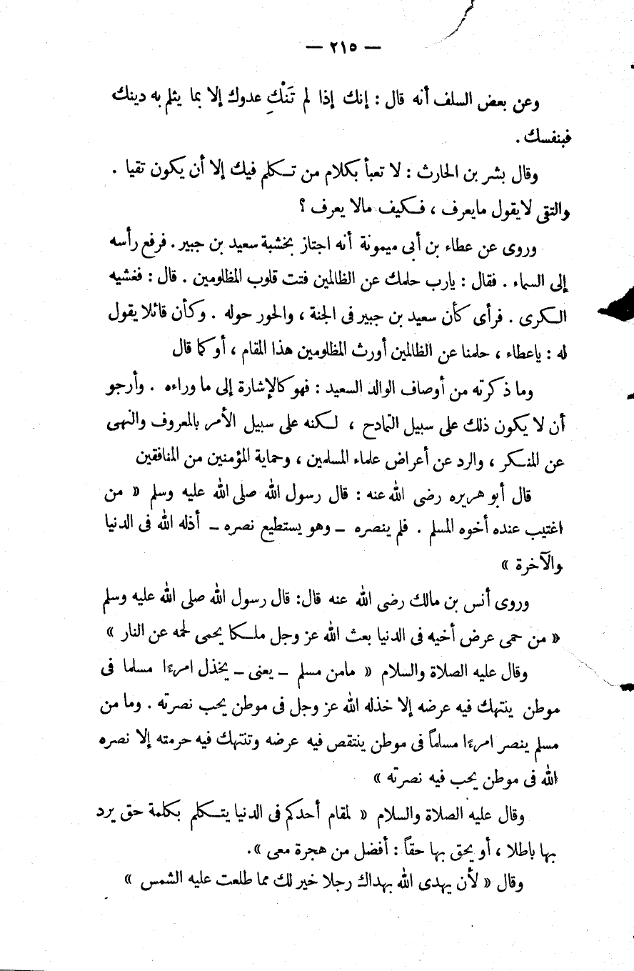 وَقَالَ عَلَيْهِ الصلاة والسلام: " ما من مسلم يعني يخذل امرءا مسلما فِي موطن ينتهك فِيهِ عرضه إلا خذله اللَّه عز وجل فِي موطن يحب نصرته وما من مسلم ينصر امرءا مسلما فِي موطن ينتقص فِيهِ عرضه وتنتهك فِيهِ حرمته إلا نصره اللَّه فِي موطن يحب فِيهِ نصرته " وَقَالَ عَلَيْهِ الصلاة والسلام: " لمقام أحدكم فِي الدنيا يتكلم بكلمة حق يرد بها باطلا أو يحق بها حقا: أفضل من هجرة معي.
