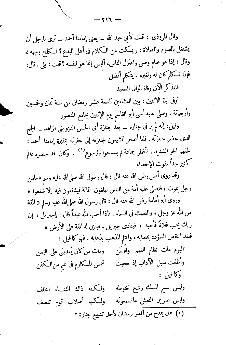 وَقَالَ المروذي: قُلْتُ لأبي عبد اللَّه - يعني إمامنا أَحْمَد - ترى للرجل أن يشتغل بالصوم والصلاة ويسكت عن الكلام فِي أهل البدع؟ فكلح وجهه وَقَالَ: إِذَا هُوَ صام وصلى واعتزل الناس أليس إنما هُوَ لنفسه؟ قُلْتُ: بلى قَالَ: فَإِذَا تكلم كَانَ لَهُ ولغيره يتكلم أفضل.