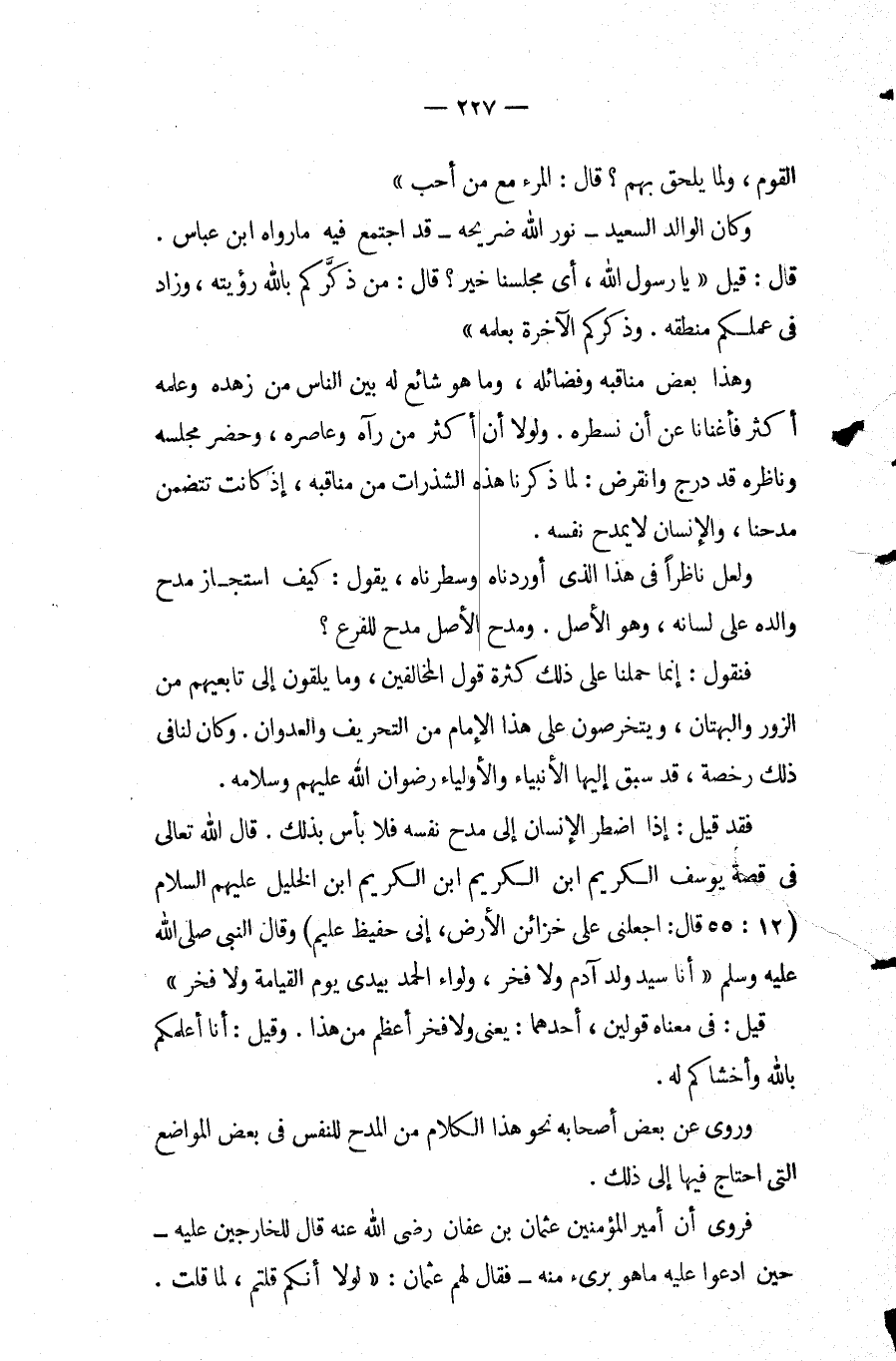 وهذا بعض مناقبه وفضائله وما هُوَ شائع لَهُ بين الناس من زهده وعلمه أكثر فأغنانا عن أن نسطره ولولا أن أكثر من رآه وعاصره وحضر مجلسه وناظره قد درج وانقرض: لما ذكرنا هَذِهِ الشذرات من مناقبه إذ كانت تتضمن مدحنا والإنسان لا يمدح نفسه.