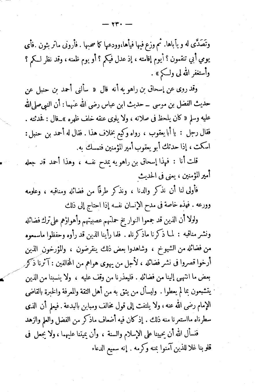 وقد روي عن إسحاق بْن راهويه أنه قَالَ: " سألني أَحْمَد بْن حنبل عن حديث الفضل بْن موسى - حديث ابْن عباس رَضِيَ اللَّهُ عَنْهُما: أن النبي - صَلَّى اللَّهُ عَلَيْهِ وَسَلَّمَ - " كان يلحظ فِي صلاته ولا يلوي عنقه خلف ظهره " قَالَ: فحدثته فَقَالَ رجل: يا أبا يعقوب رواه وكيع بخلاف هَذَا فَقَالَ لَهُ أَحْمَد بْن حنبل: اسكت إِذَا حدثك أَبُو يعقوب أمير المؤمنين فتمسك به.