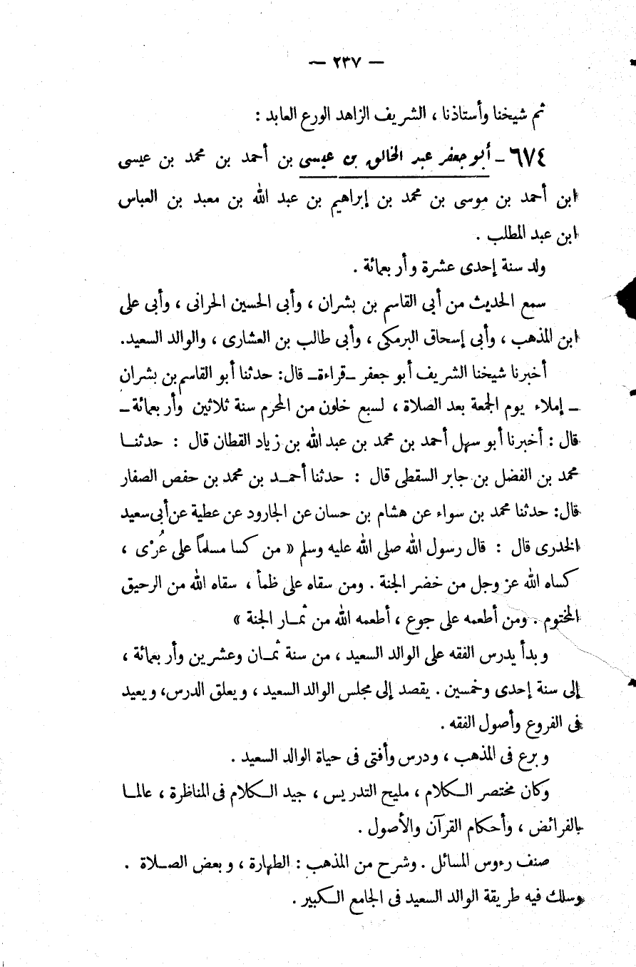 أَبُو جَعْفَر عبد الخالق بْن عيسى بْن أَحْمَد بن محمد بْنِ عِيسَى بْن أَحْمَد بْن موسى بْن مُحَمَّد بن إبراهيم بْن عَبْدِ اللَّهِ بْن معبد بْن العباس بْن عبد المطلب: