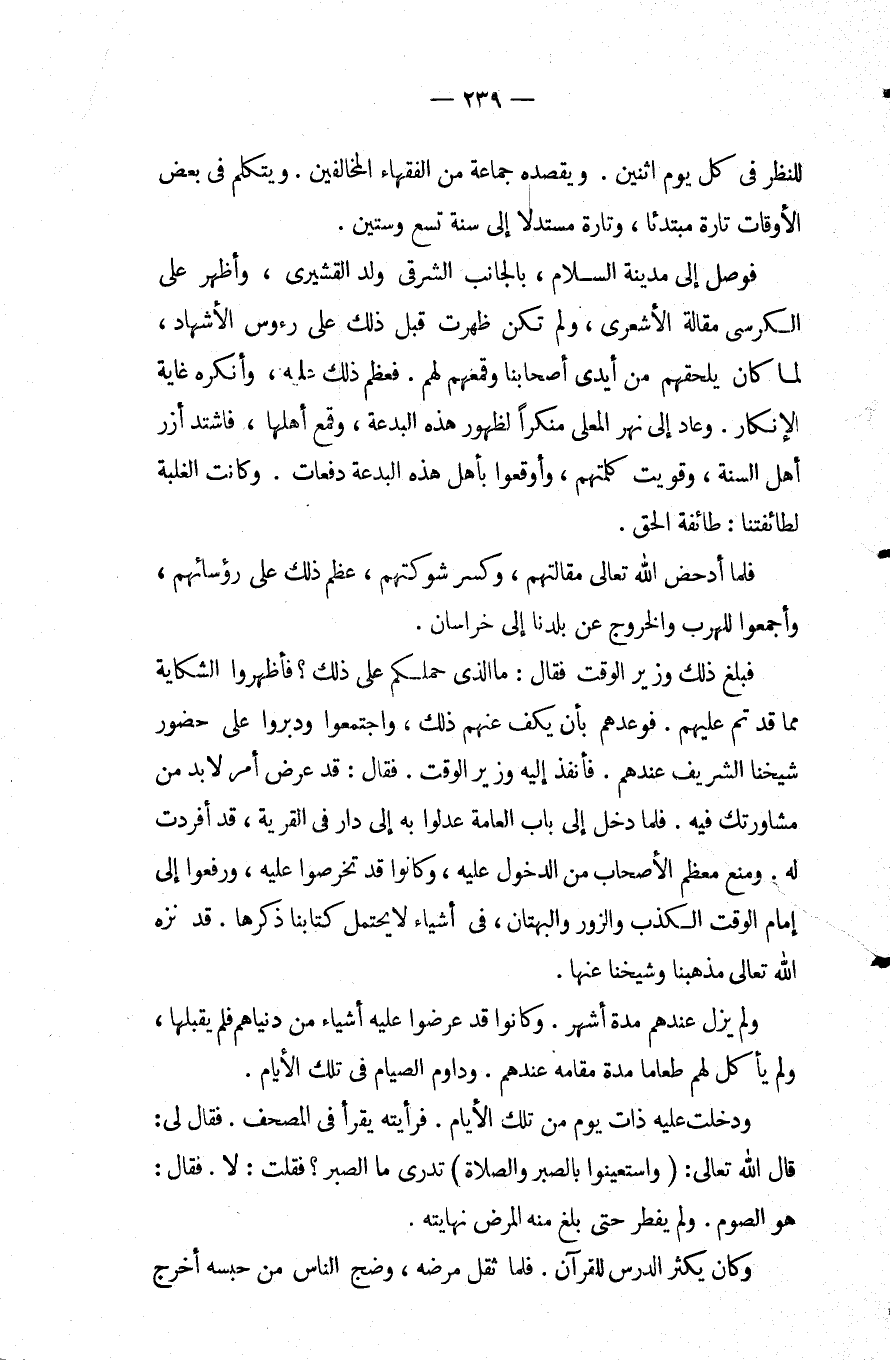 فوصل إلى مدينة السلام بالجانب الشرقي ولد القشيري وأظهر عَلَى الكرسي مقالة الأشعري ولم تكن ظهرت قبل ذَلِكَ على رؤوس الأشهاد لما كَانَ يلحقهم من أيدي أصحابنا وقمعهم لهم فعظم ذلك عليه وأنكره غاية الإنكار وعاد إلى نهر المعلى منكرا لظهور هَذِهِ البدعة وقمع أهلها فاشتد أزر أهل السنة وقويت كلمتهم وأوقعوا بأهل هَذِهِ البدعة دفعات وكانت الغلبة لطائفتنا: طائفة الحق.