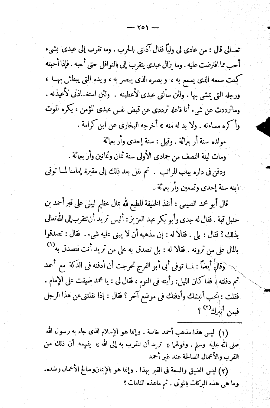 تَعَالَى قَالَ: مَنْ عَادَى لي ولياً فقال آذَنَنِي بِالْحَرْبِ وَمَا تَقَرَّبَ إِلَيَّ عَبْدِي بِشَيءٍ أَحَبَّ مِمَّا افْتَرَضْتُ عَلَيْهِ وَمَا يَزَالُ عَبْدِي يَتَقَرَّبُ إِلَيَّ بِالنَّوَافِلِ حَتَّى أُحِبَّهُ فَإِذَا أَحْبَبْتُهُ كُنْتُ سَمْعَهُ الَّذِي يَسْمَعُ بِهِ وَبَصَرَهُ الَّذِي يُبْصِرُ بِهِ وَيَدَهُ الَّتِي يَبْطِشُ بِهَا وَرِجْلَهُ الَّتِي يَمْشِي بِهَا وَلَئِنْ سَأَلَنِي عَبْدِي لأُعْطِيَنَّهُ وَلَئِنِ اسْتَعَاذَنِي لأُعِيذَنَّهُ وَمَا تَرَدَّدْتُ عَنْ شَيْءٍ أَنَا فَاعِلُهُ تَرَدُّدِي عَنْ قَبْضِ نَفْسِ عَبْدِي الْمُؤْمِنِ يَكْرَهُ الْمَوْتَ وَأَكْرَهُ مَسَاءَتَهُ وَلا بُدَّ لَهُ مِنْهُ " أخرجه البخاري عن ابْن كرامة.