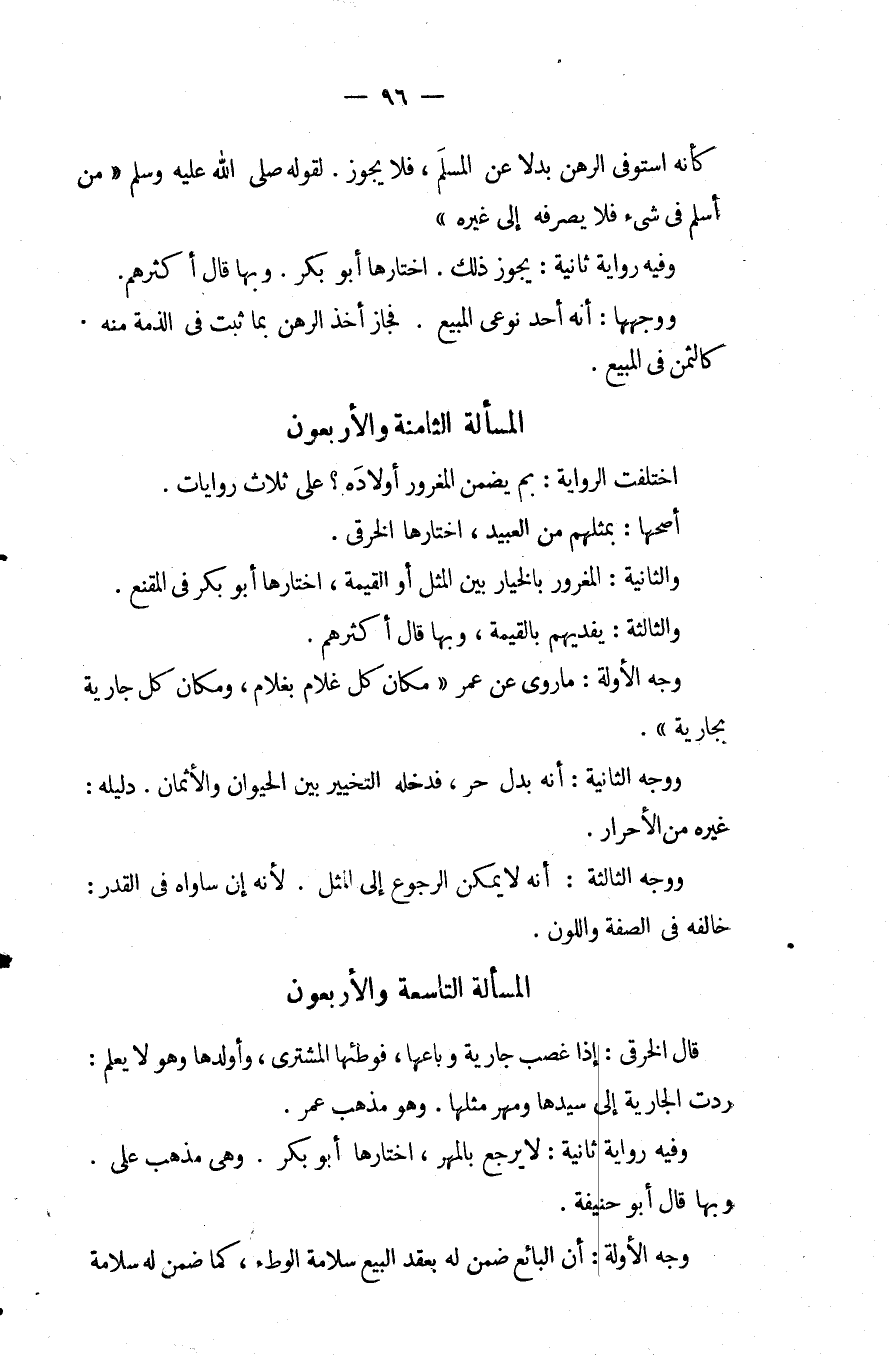 المسألة الثامنة والأربعون اختلفت الرواية: بم يضمن المغرور أولاده؟ عَلَى ثلاث روايات.