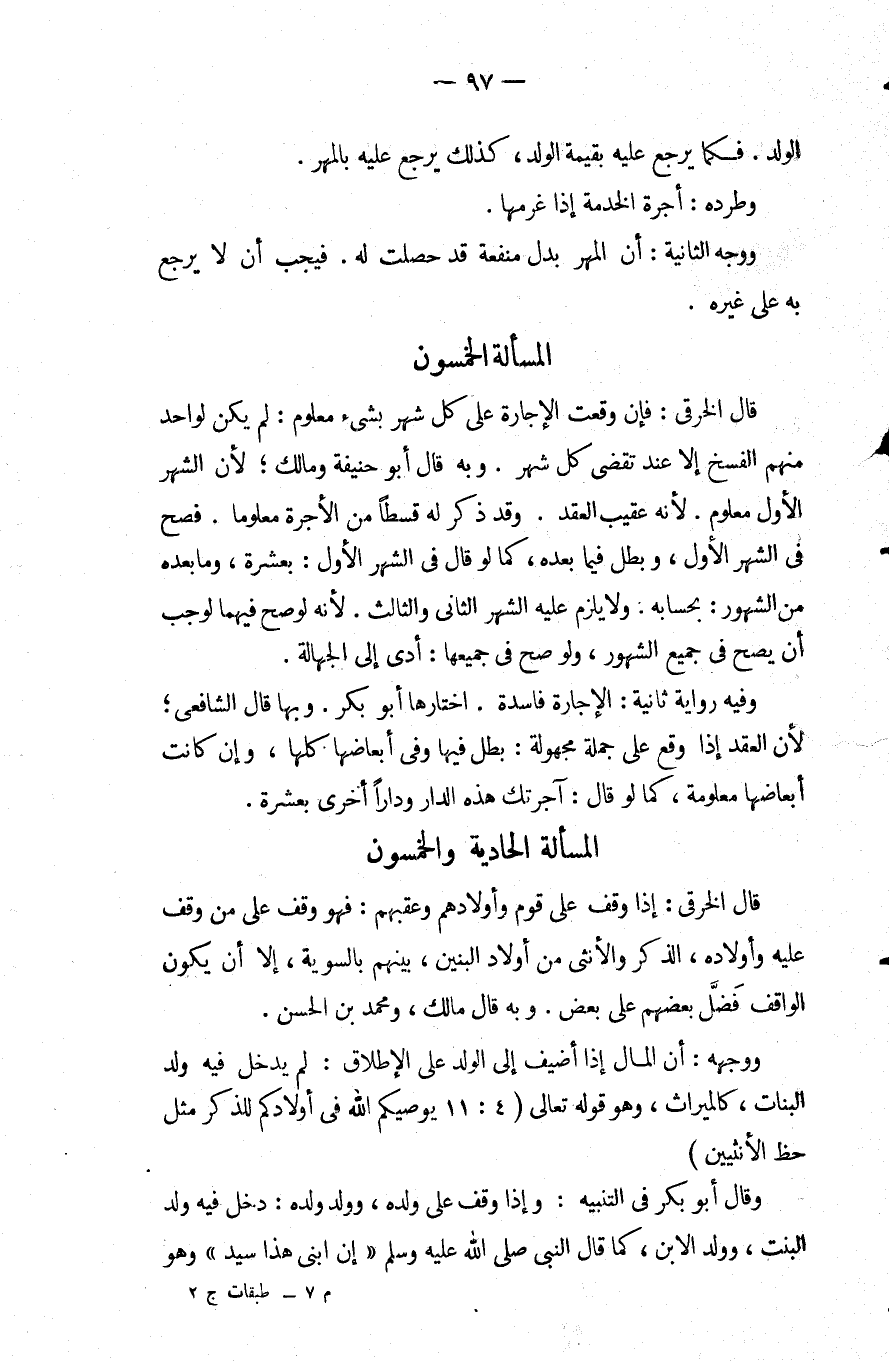 المسألة الحادية والخمسون قَالَ الخرقي: إِذَا وقف عَلَى قوم وأولادهم وعقبهم: فهو وقف عَلَى من وقف عَلَيْهِ وأولاده الذكر والأنثى من أولاد البنين بينهم بالسوية إلا أن يكون الواقف فضل بعضهم عَلَى بعض وبه قَالَ مالك ومحمد بْن الحسن.